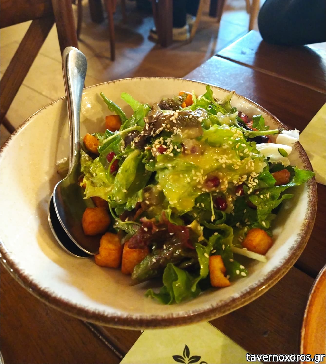 Σαλάτα χειμωνιάτικη με πράσινα λαχανικά, σπόρια ροδιού, σουσάμι, τηγανητό χαλούμι και γλυκόξινη σάλτσα κρεμμυδιού (οκ, δεν κατάλαβα τι εννοούσαν με τη σάλτσα κρεμμυδιού)