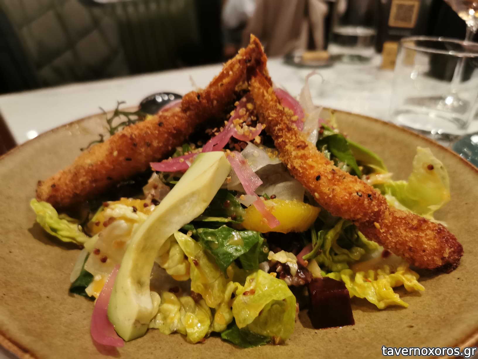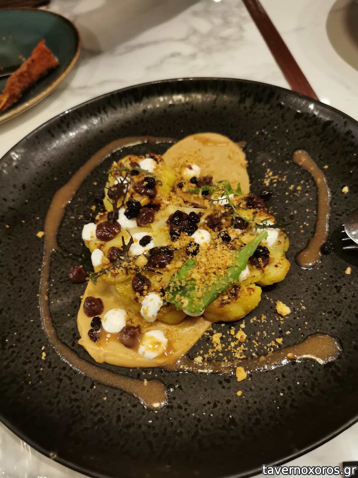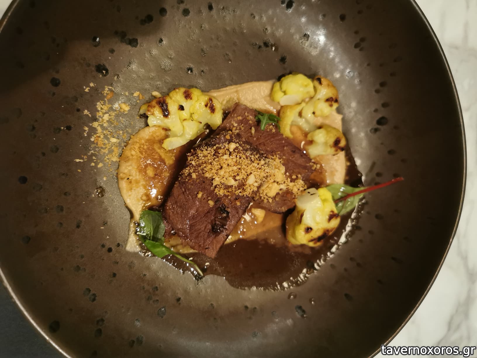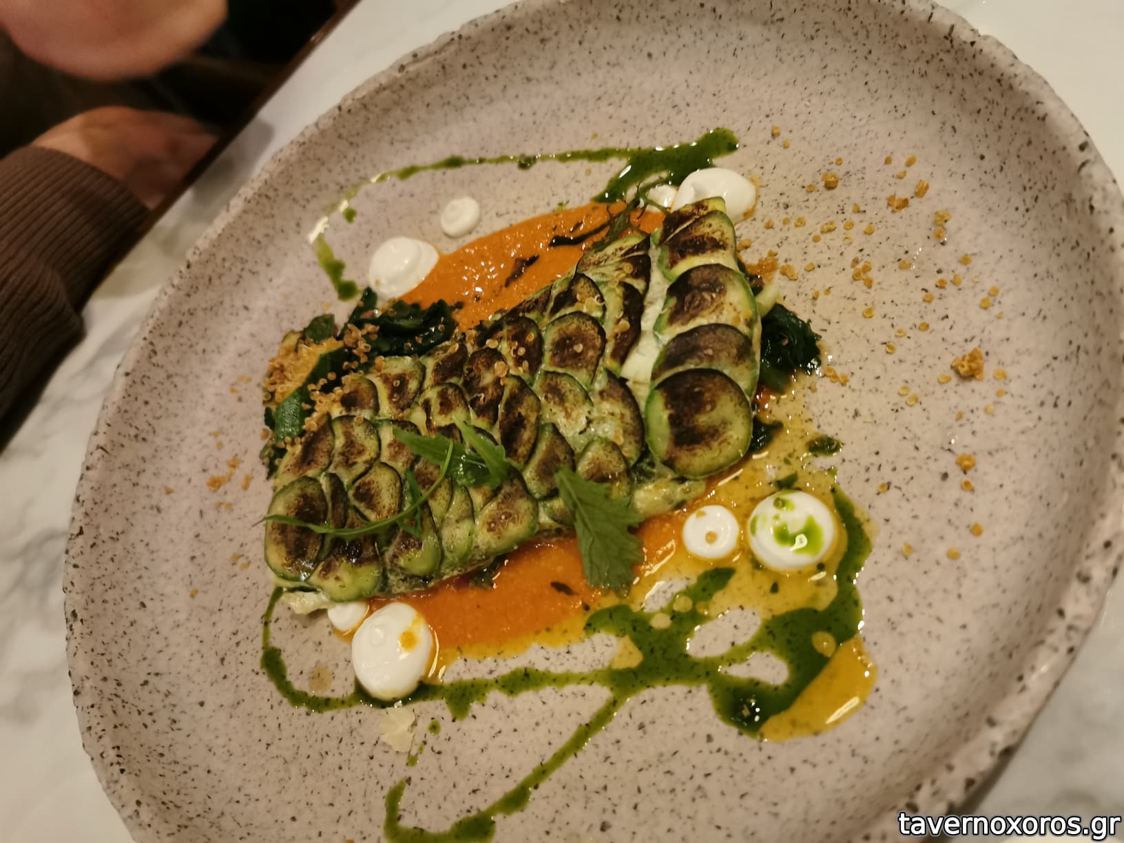 Καλωσορισμα με μια βελουτέ σούπα κρεμμύδι θυμάρι σε φλυτζανακι του καφέ, νόστιμη, σαλάτα πορτοκαλί γαρίδες αβοκάντο πολύ καλή, ορεκτικό κουνουπίδι μπέικον αδιάφορο, λαβράκι γεμιστό με σπανάκι και κολοκύθι, αδιάφορο, μοσχαρίσια μάγουλα με κουνουπίδι επίσης αδιάφορα, κοινώς Αδιαφορία εις τον κύβο.