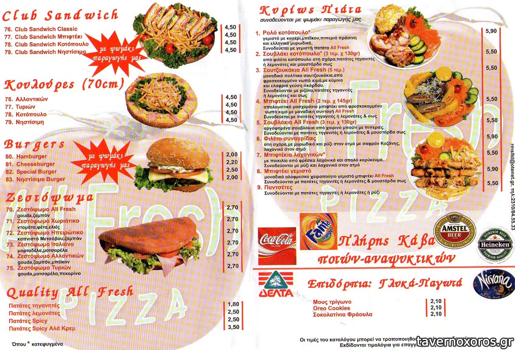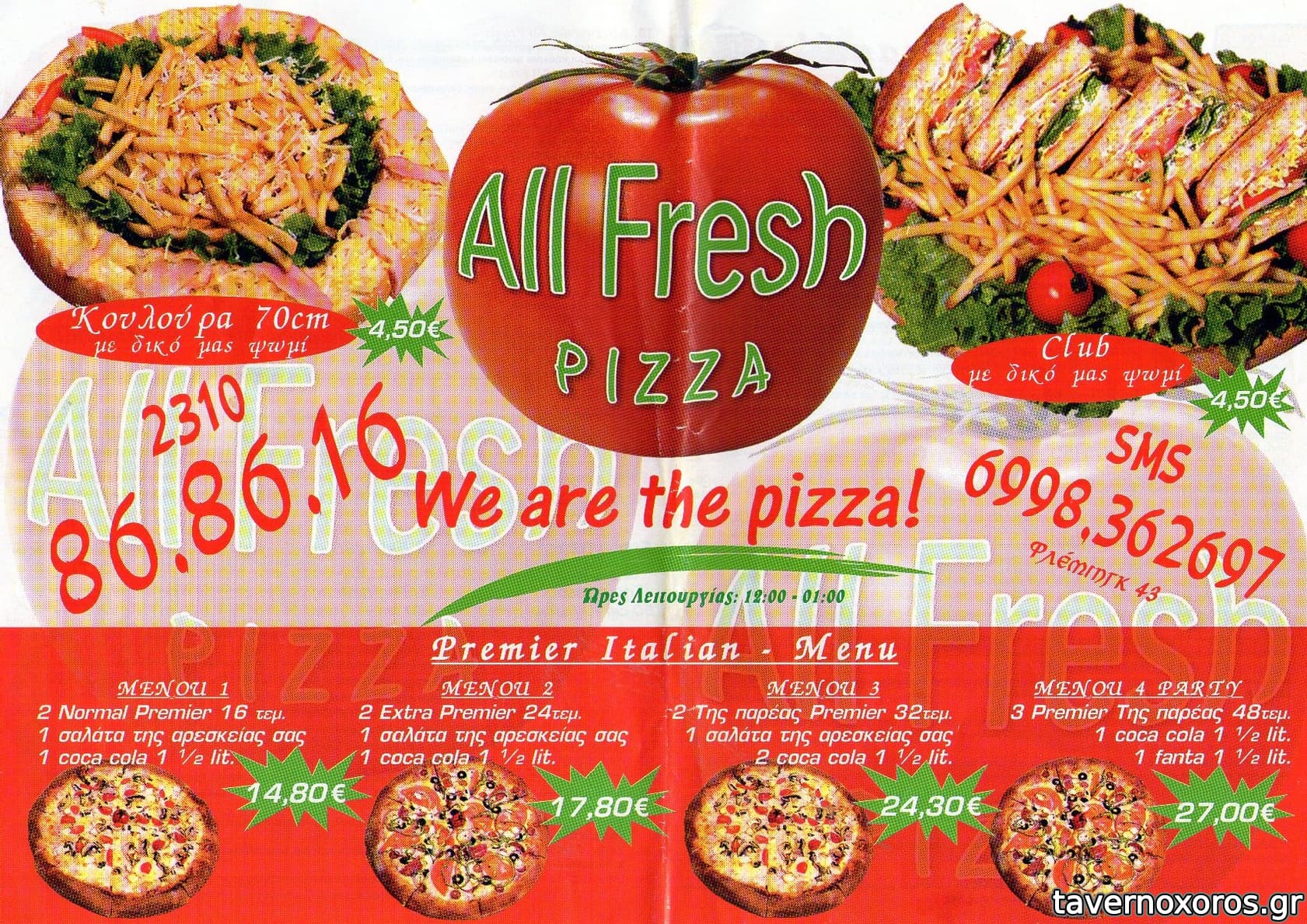 Επαιρνα απο το allfresh πριν απο 2-3 χρονια οταν ημουν φοιτητης.Ειχε ζωοδης μεριδες και τρελες πατεντες οπως,κουλουρα γεμιστη με κασερι και γυρο!,κουνελι burger,πιτσα με γυρο στρουθοκαμηλο και οτι αλλο μπορουσε να φανταστει (μονο την γιαγια του δεν εβαζε :P) Οταν τελειωσα απο το στρατο και βρηκα ξανα το φυλλαδιο του απογοητευτικα πληρως. Οι τιμες ανεβηκαν κατα 40%+. Ενταξει μαστορι ειπαμε περνουσε κριση το πετρελαιο αλλα οχι και ετσι....Αξιζει μια δοκιμη για τις πατεντες οχι απο αποψη ποιοτητας αλλα προτοτυπιας.CMON!!