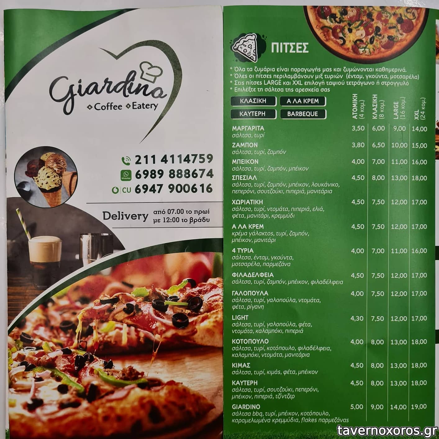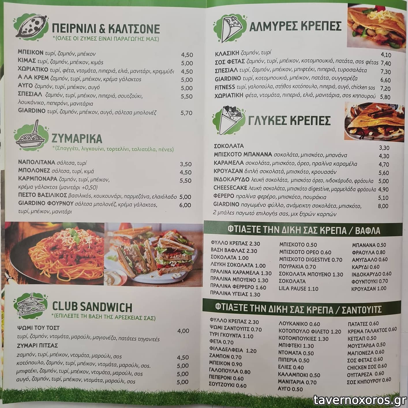 | Λέξεις κλειδιά | Τζιαρντίνο, #πλατεία, #πάρκο, #συντριβάνι, #snacks, #cafe-pizza, #κρέπες, #βάφλες, #ζυμαρικά, #μακαρονάδες, #πεϊνιρλί, #καλτσόνε, #σκορδόψωμο, #club sandwich, #μανιτάρια, #κοτόπουλο, #σαλάτες |