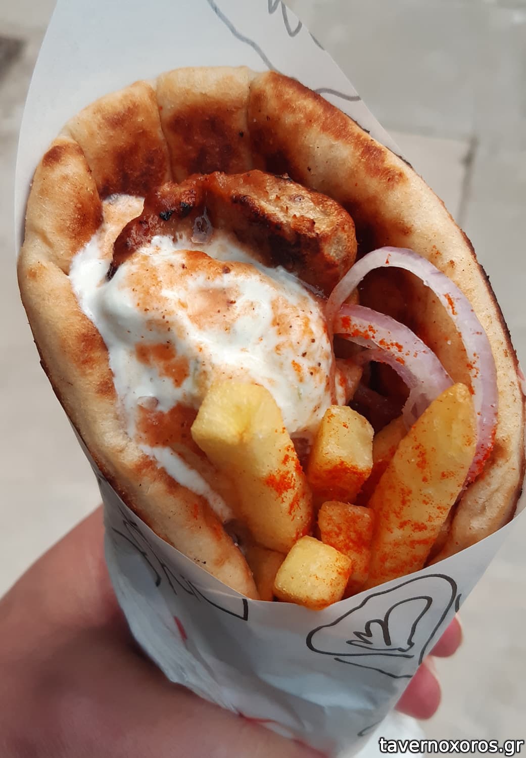 Τα τυλιχτά (με γύρο χοιρινό και κοτόπουλο, που οπτικά και γευστικά φαίνονται χειροποίητοι) πάρα πολύ καλά. Η κόκκινη σάλτσα -ελαφρώς γλυκίζουσα- τα σπρώχνει προς έναν ισορροπημένο γευστικό μαξιμαλισμό. Η πίτα πολύ καλή και λαδωμένη όσο πρέπει.