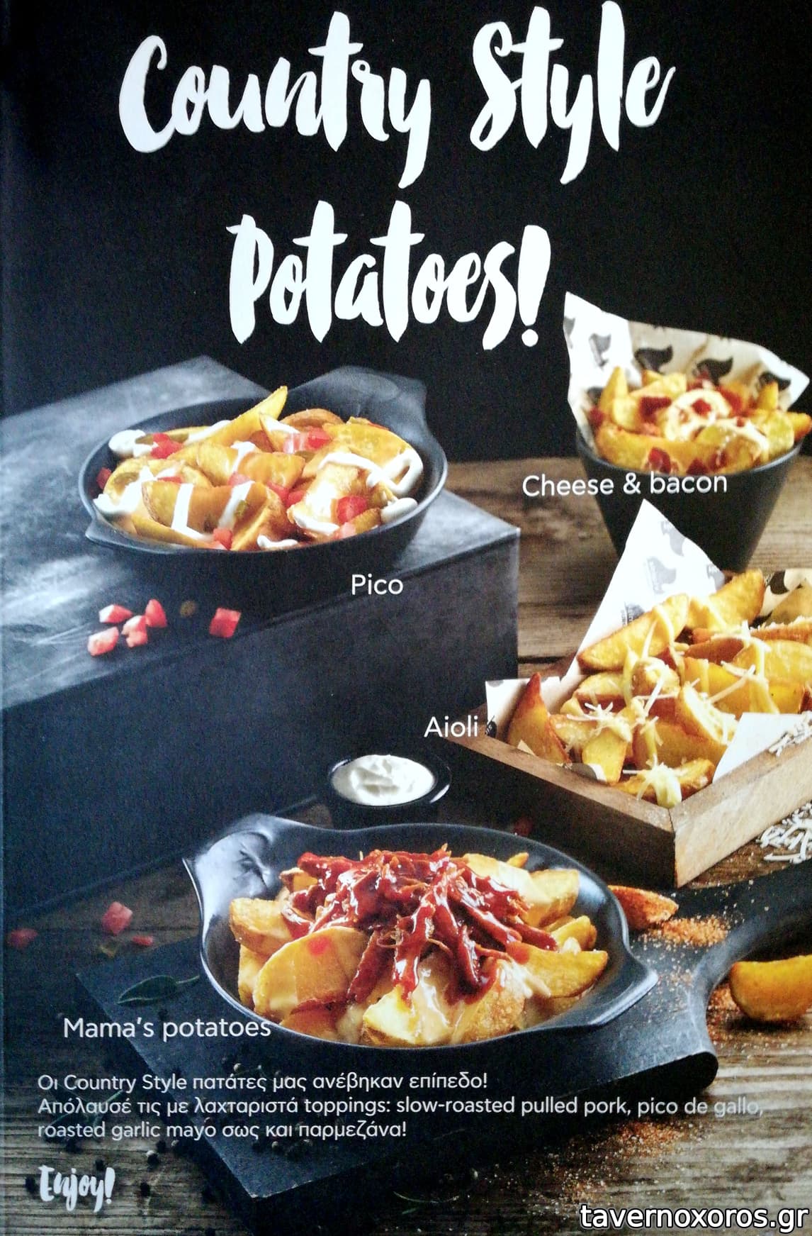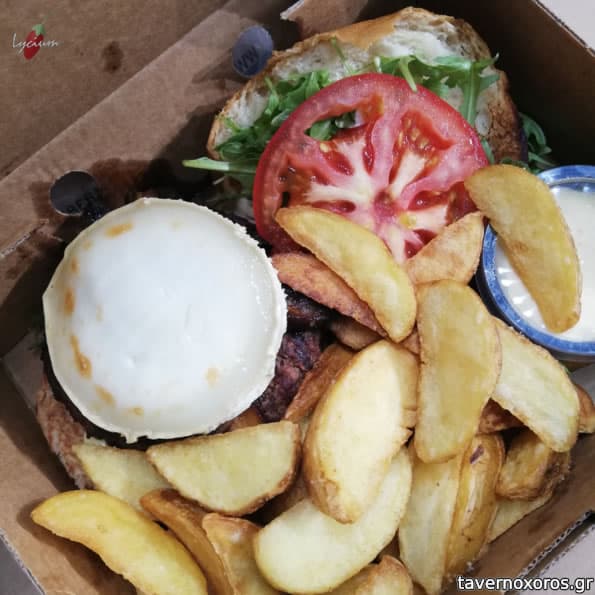 Φρέσκα μανιτάρια Portobello σοτέ, κατσικίσιο τυρί, ρόκα, ντομάτα και Roasted Garlic Mayo σως σε ψωμάκι brioche συνοδευόμενο από country style πατάτες.