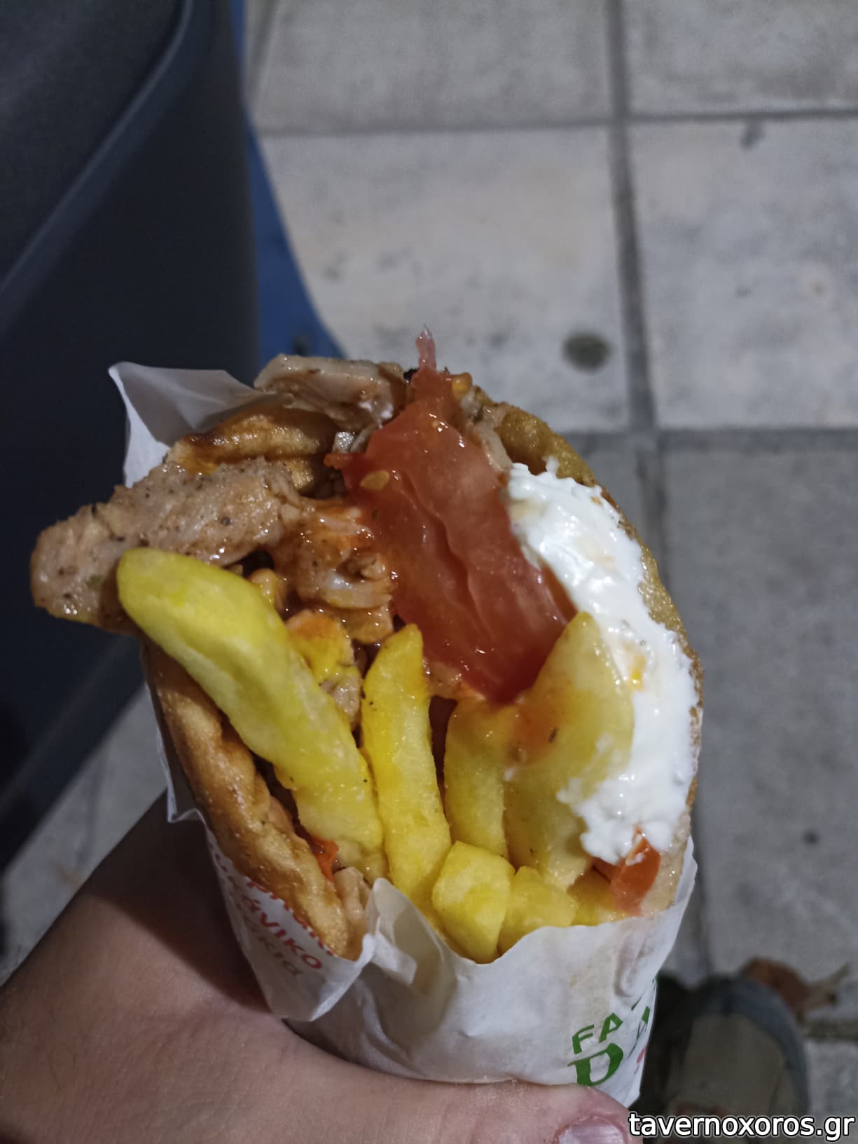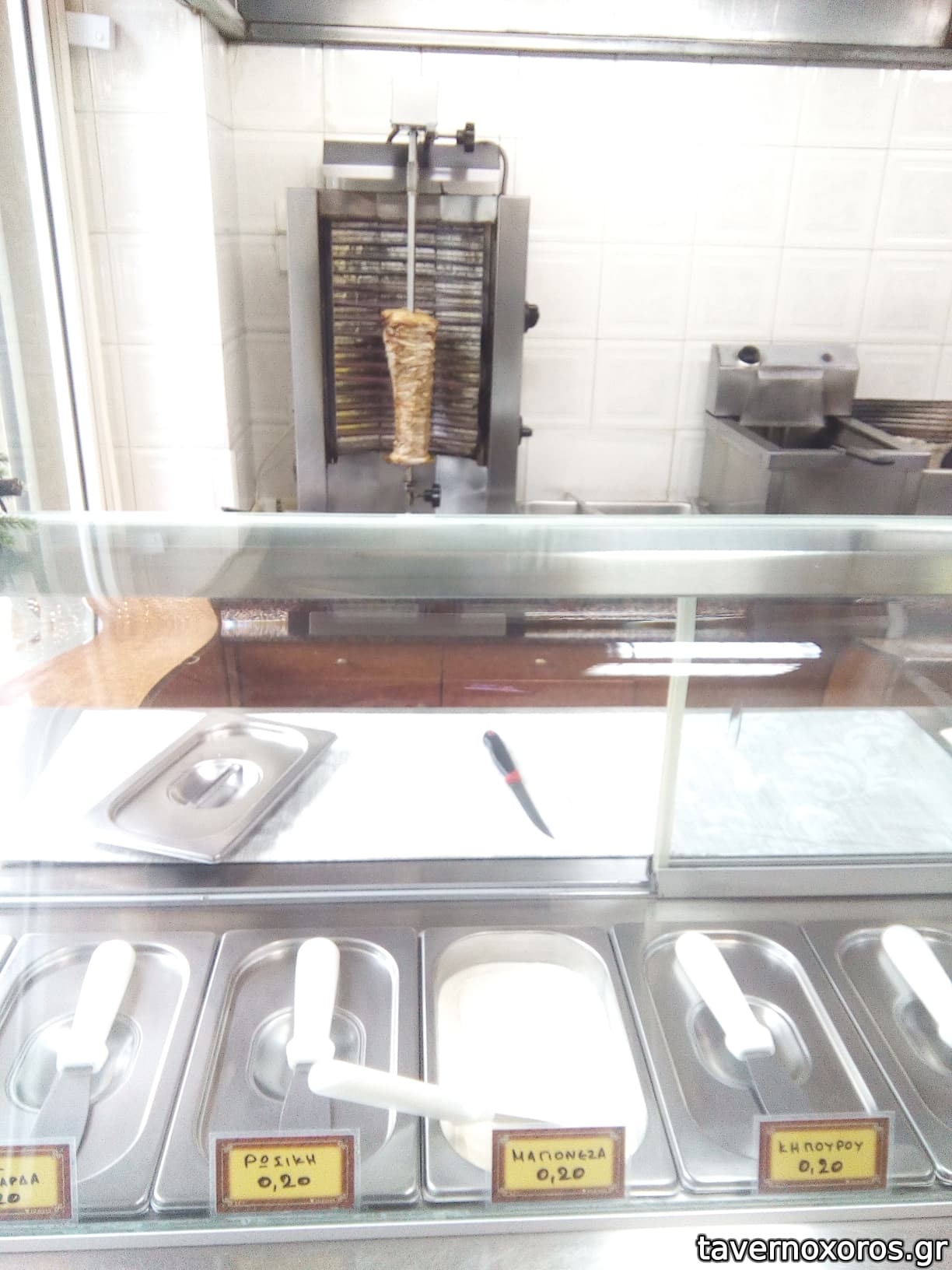 Φτάνοντας, βρίσκω περί τα 5 άτομα ουρά. Με το που με βλέπει ο ιδιοκτήτης και μην έχοντας παραγγείλει όλοι οι προηγούμενοι, ρωτά: "Τί θα κάνουμε;". Γύρο καταφέρνω να ψελλίσω, αρχικά με έκπληξη, που σιγά-σιγά γινόταν ισχνή αυτοπεποίθηση. "Μέχρι εσένα και αν φτάσει", με ενημερώνει, ευγενικά. Η ώρα 21:30. Τα παίζω όλα για όλα και επιλέγω την αναμονή, όντας περαστικός απ' την πόλη και έχοντας σταματήσει επί τούτου. Αν κάτι μου αρέσει όταν περιμένεις τη σειρά σου, είναι η παρατήρηση της ρουτίνας (προ)ετοιμασιών και εξυπηρέτησης. Ο γύρος κόβεται σε μικρές δόσεις, ώστε να ψηθεί καλά, οι πίτες τηγανίζονται (αλήθεια, πόσο καιρό είχα να δω αυτό το πράγμα..), οι πατάτες σε μικρά batches για να μην κρυώνουν. Παρατηρείς τη φροντίδα από το ζευγάρι (?) των ιδιοκτητών σε κάθε του κίνηση, από το τύλιγμα μέχρι τα ρέστα.