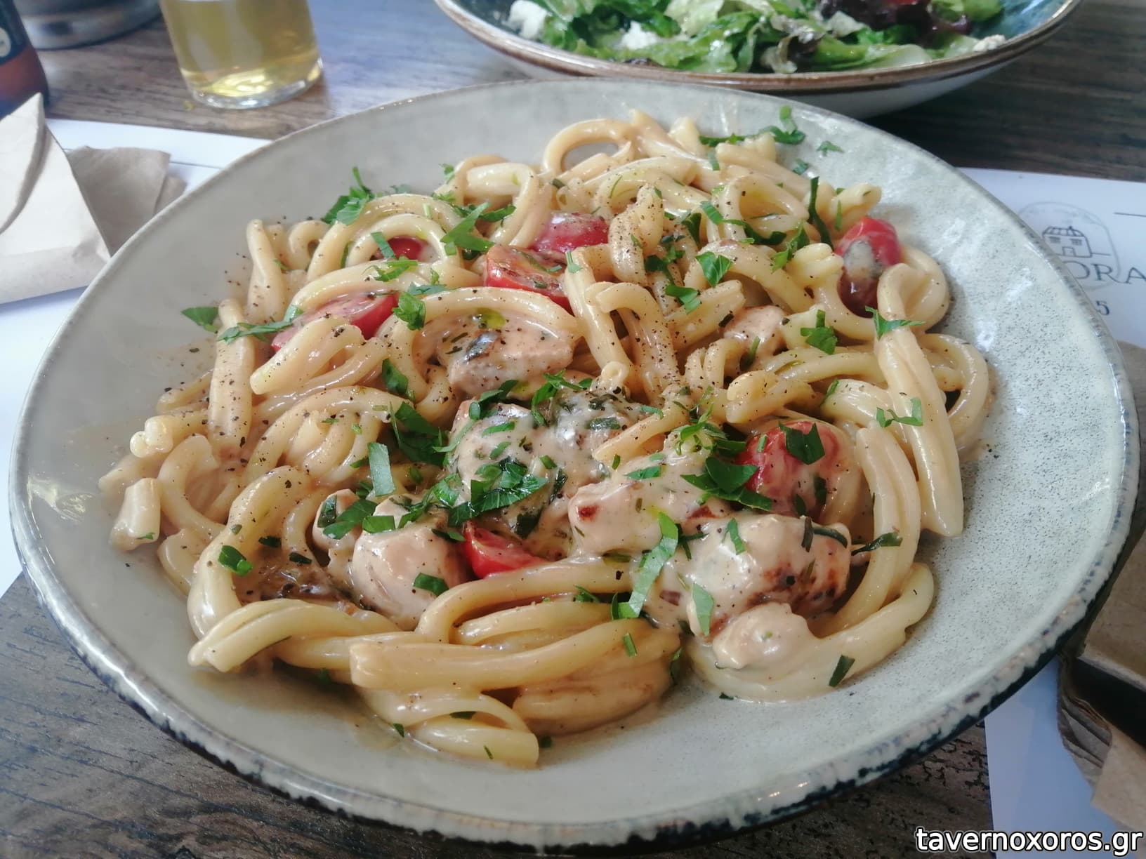 "Χειροποίητα ζυμαρικά με κοτόπουλο, σάλτσα γραβιέρας, ντοματίνια, εστραγκόν" (12€, γευστικό, τίμια μερίδα)