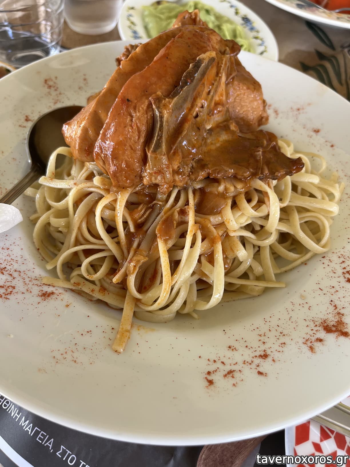 Κόκκορας με λιγκουίνι με αρκετή κανέλα και το ζυμαρικό να μην έχει βράσει στο ζουμί. Ο κόκκορας ομως σε μεγάλη ποσότητα.