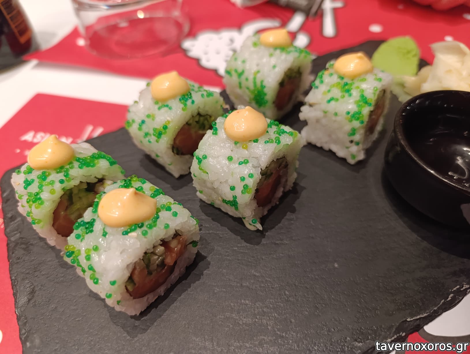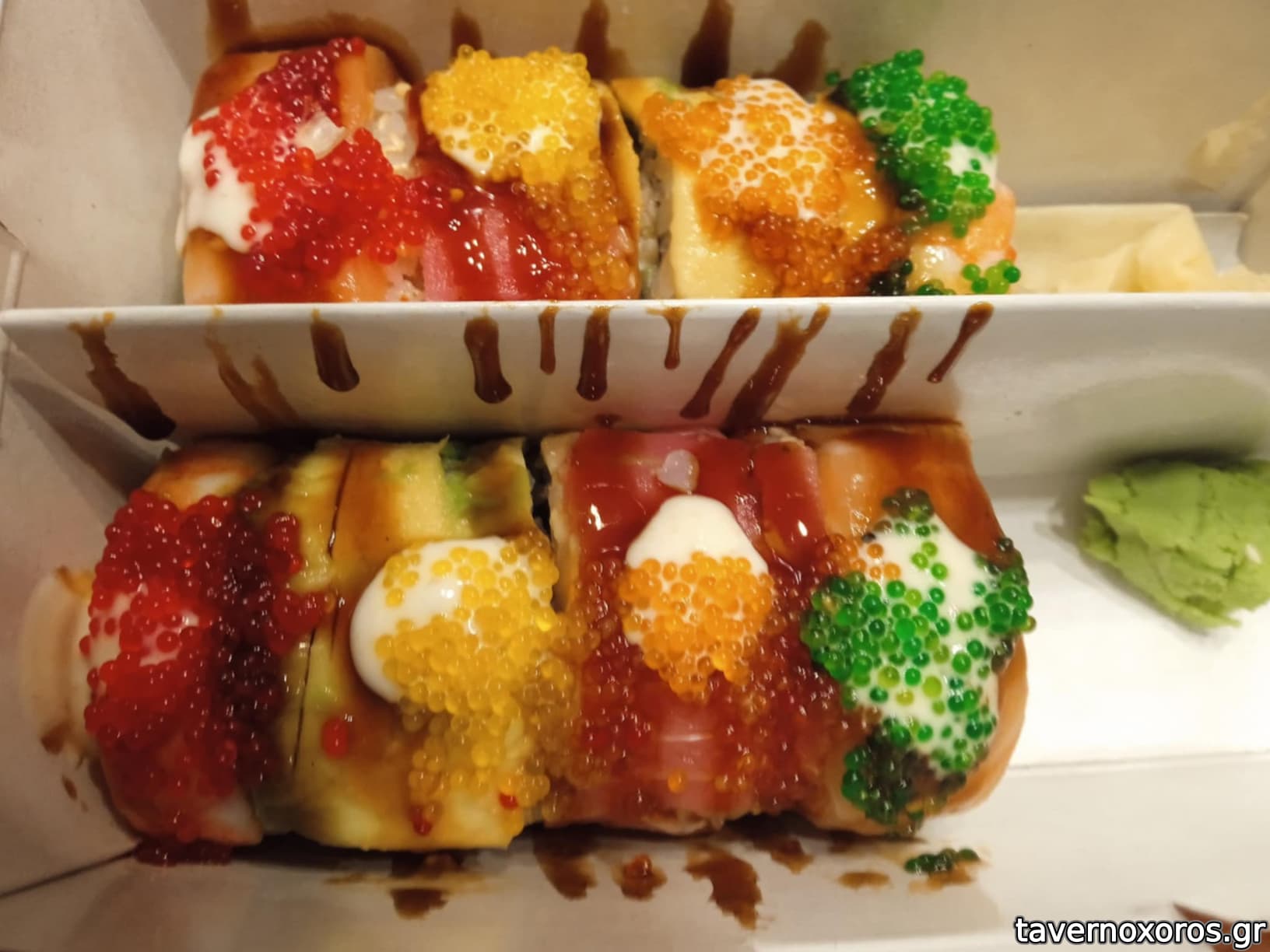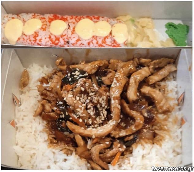 Πάνω Ebi tempura rolls (7,60 €) και κάτω τεριάκι χοιρινό (9,80 €)