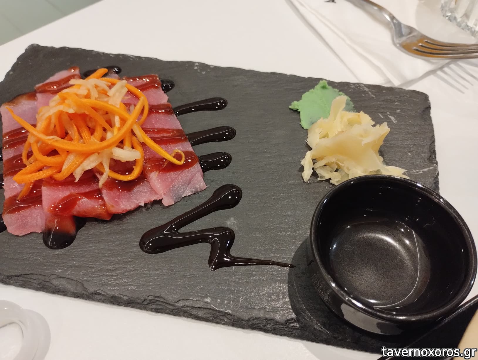 Tuna sashimi, φέτες. Δεν είχαν το ίδιο εφέ, λίγο φέρνουν σε σαλάμι