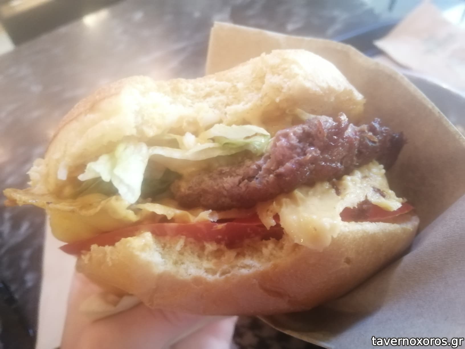 Potato bun με iceberg, ντομάτα, βιολογικό cheddar, πίκλες και snb sauce" (6,