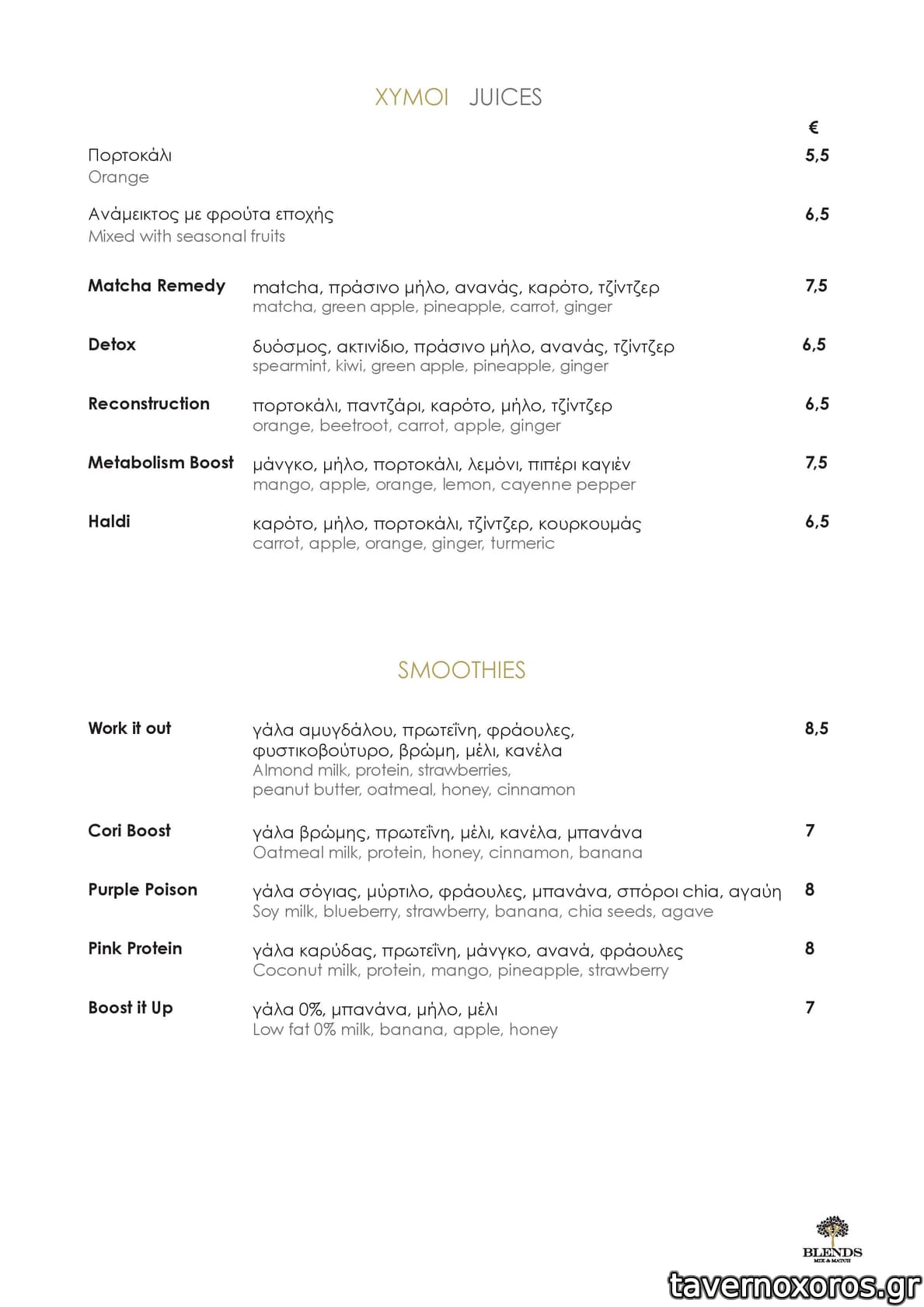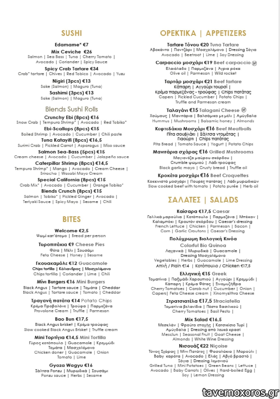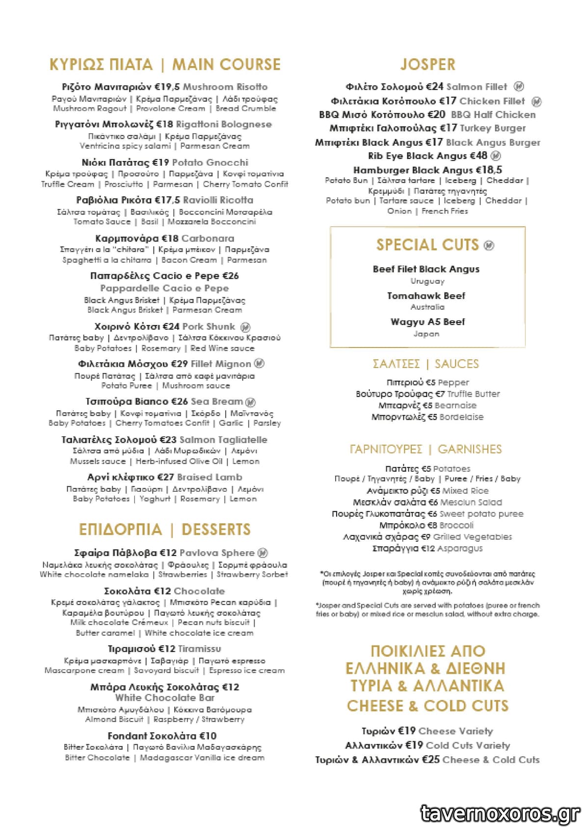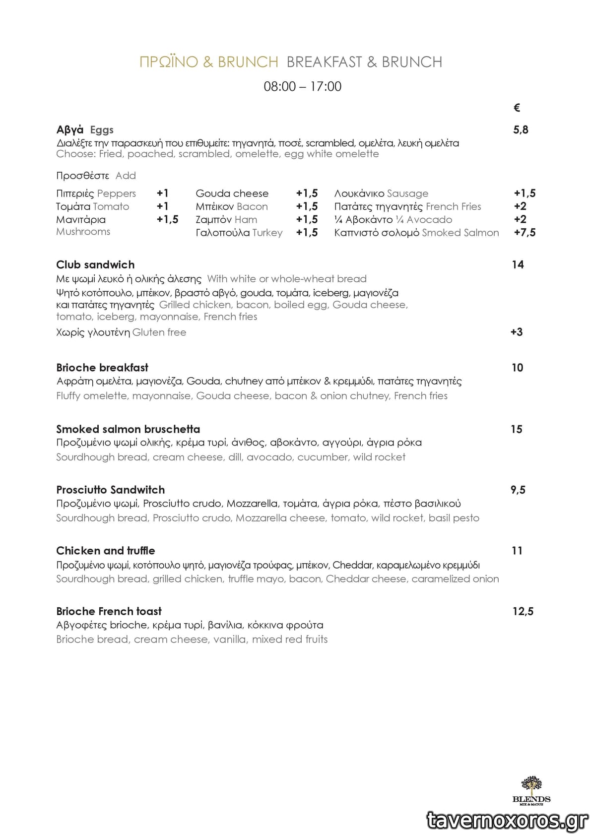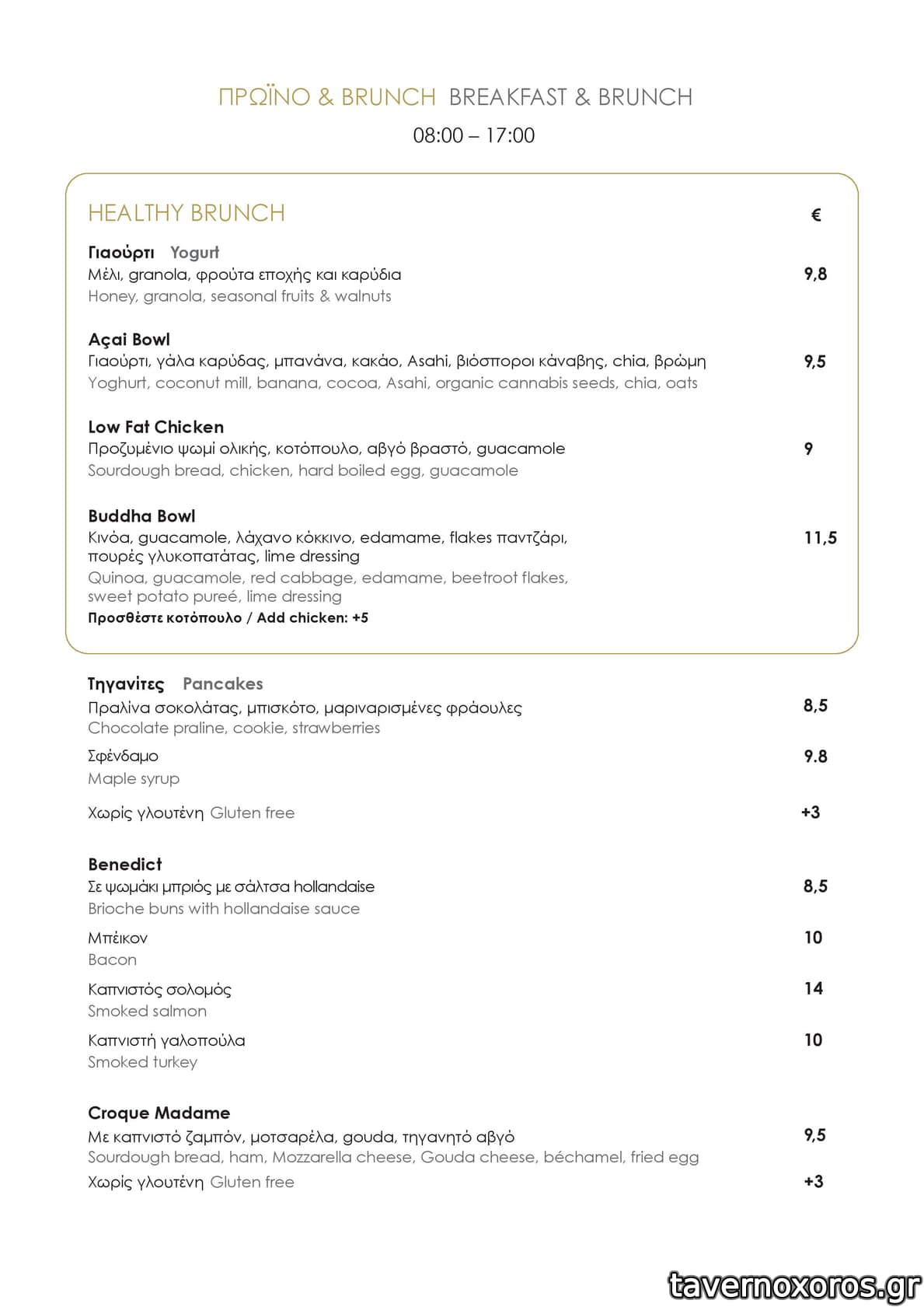 | Λέξεις κλειδιά | #brunch, #cafe-bar, #πρωινό, #αυγά, #ομελέτα, #σάντουιτς, #αυγόφετες, #club sandwich, #προζυμένιο ψωμί, #καφές, #τσάι, #χυμοί, #smoothies, #παγωτό, #sushi, #μανιτάρια, #κεφτεδάκια, #burgers, #bao bun, #tortillas, #γύρος, #μπιφτέκι, #κοτόπουλο, #γαλοπούλα, #ζυμαρικά, #νιόκι, #σολομός, #ραβιόλι, #κοπές, #steaks, #wagyu, #κότσι, #αρνάκι, #κλέφτικο, #πάβλοβα, #τιραμισού |