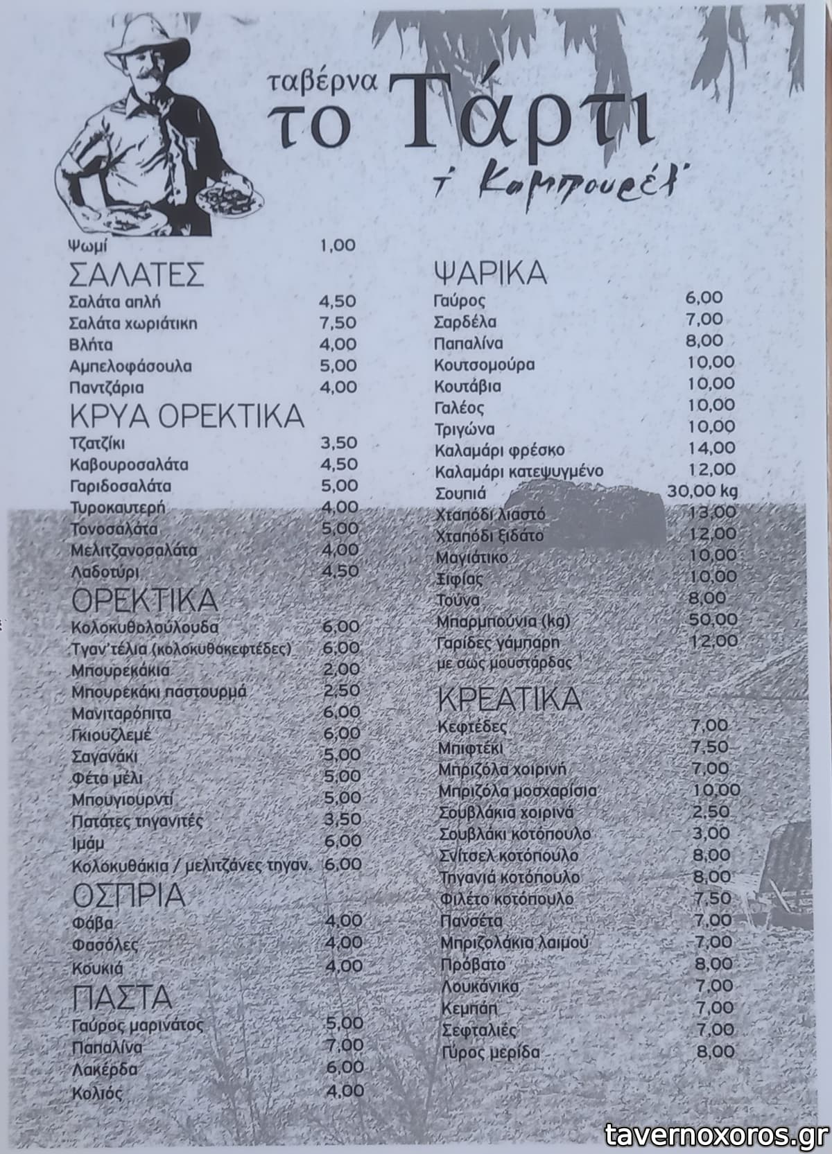 Συνολικά δοκιμάστηκαν, ντοματοσαλάτα εξαιρετική, χταποδάκι άπαιχτο, γκιουζλεμές πολύ καλός και πελώριος, σαρδέλα πεντανόστιμη, κουτσομούρες πολύ καλές, κολοκυθοκεφτέδες πολύ καλοί, κολοκυθοανθοί εξαιρετικοί, μουρμούρι ψητό πολύ καλό, μηλοκόπι εξαιρετικό.
