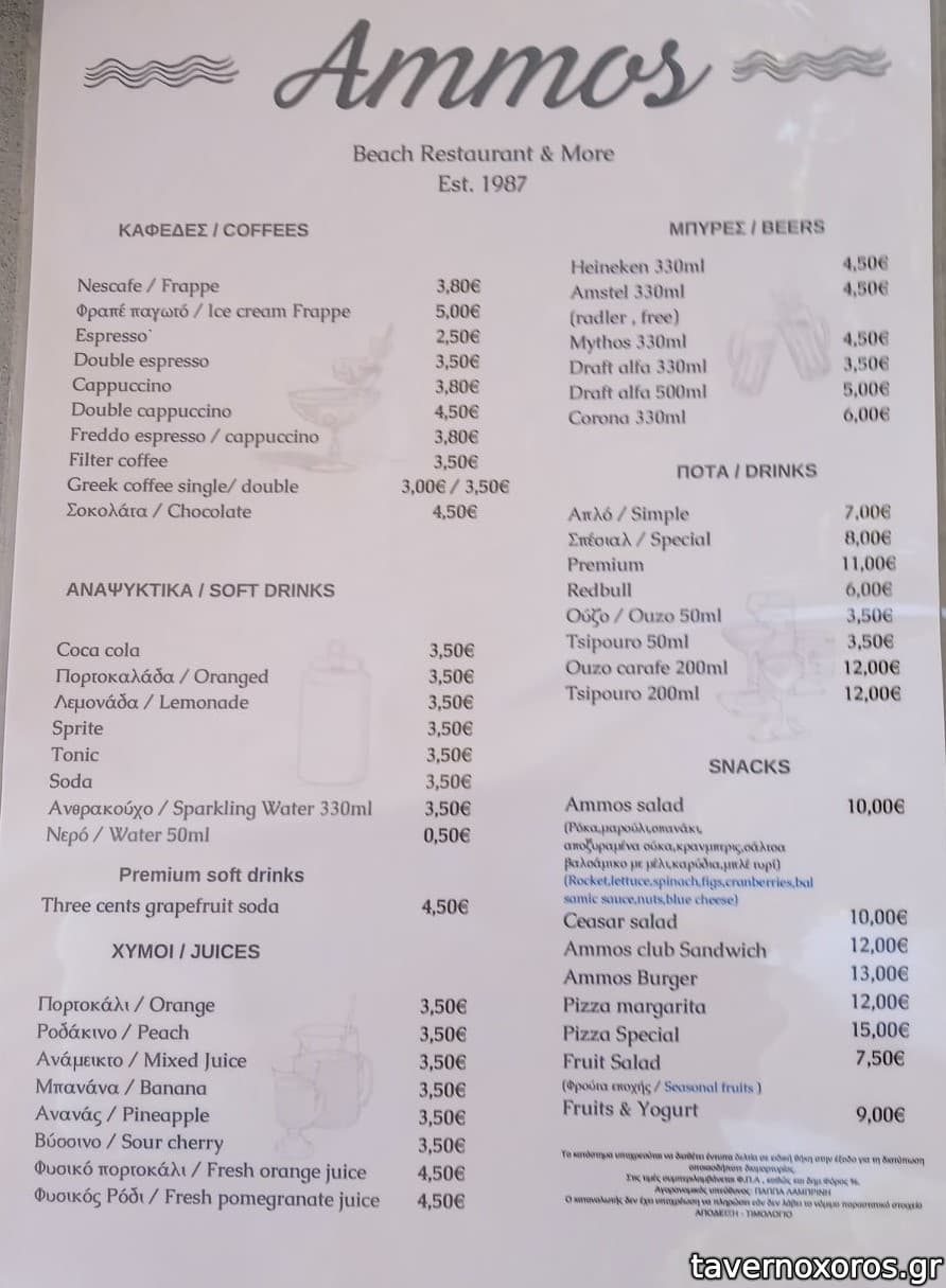 | Λέξεις κλειδιά | Άμμος, #ξαπλώστρες, #beach bar, #γρασίδι, #δέντρα, #σκιά, #cafe, #σκορδόψωμο, #φάβα, #κολοκυθοκεφτέδες, #χαλούμι, #γαύρος μαρινάτος, #χταπόδι, #μύδια, #γαρίδες, #θράψαλα, #σαρδέλα, #γαύρος, #γαριδομακαρονάδα, #ζυμαρικά, #μακαρονάδες, #μουσακάς, #γεμιστά, #αρνάκι ριγανάτο, #σουβλάκι, #μπιφτέκι, #χοιρινή, #κοτόπουλο, #πίτσα, #burgers, #club sandwich, #coffee, #χυμοί, #καφές, #μπύρα βαρελίσια |