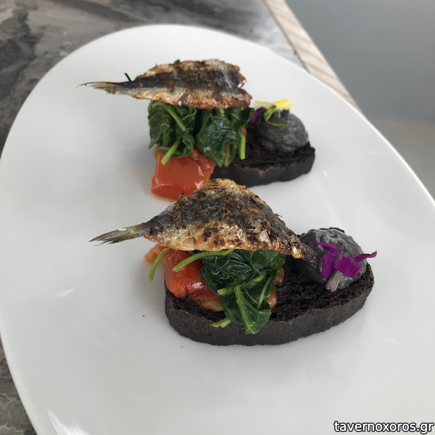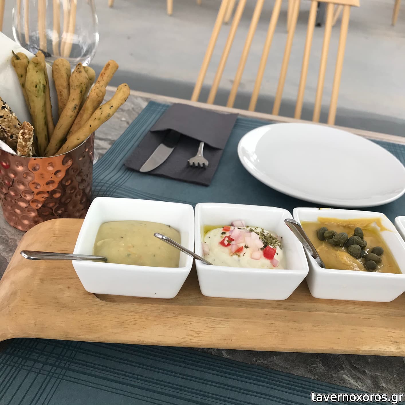 Για τις απλές δοκιμές κρασιού, έρχονται 4 συνοδευτικά: φάβα, ελιές, ξινοτύρι και ντιπ μελιτζάνας, μαζί με ωραία χειροποίητα κριτσίνια. Αυτό στο σάιτ το αναφέρει ως "