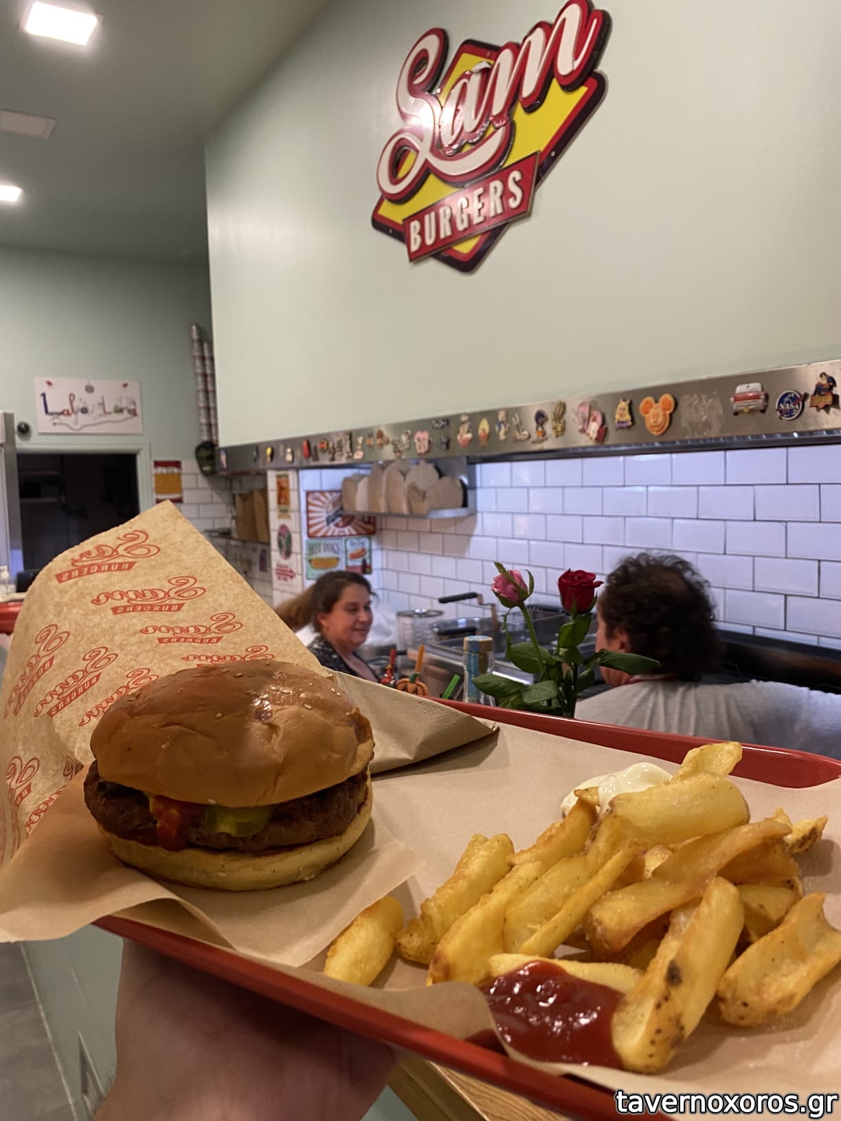 Burger Americano με πίκλα και τσένταρ σος (πολύ καλό, κρεατένιο, χωρίς την κρεατίλα)