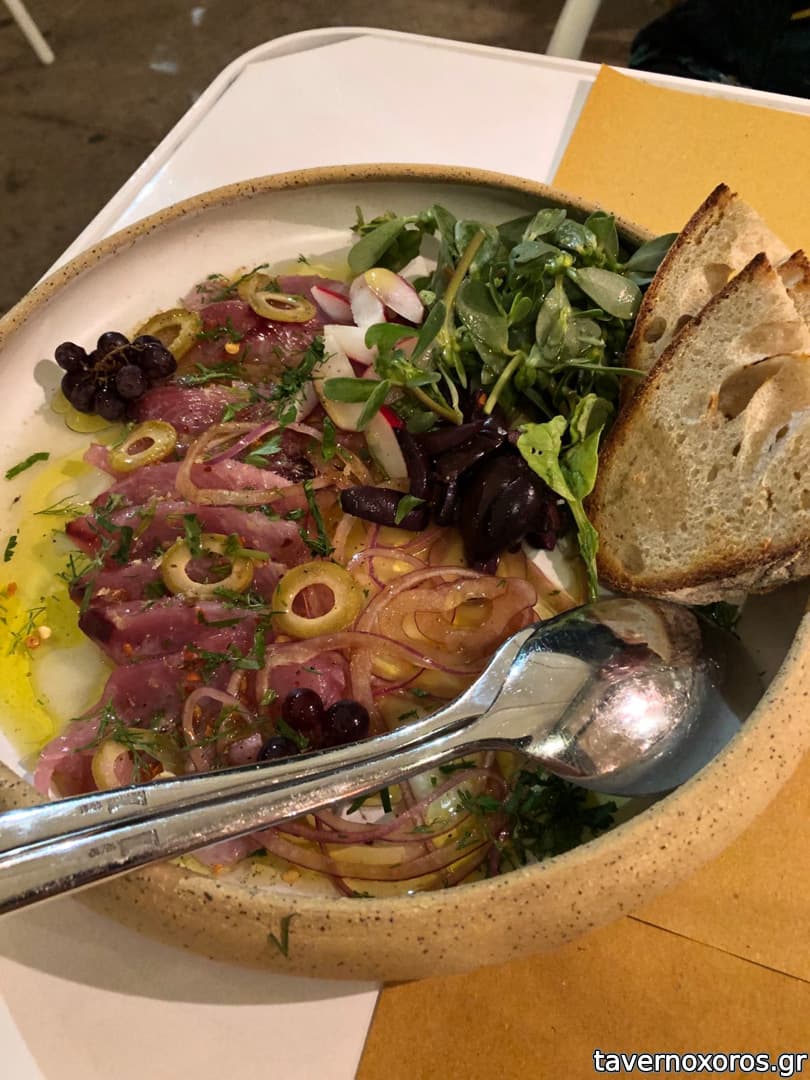 - ψωμί δικό τους προζυμένιο, αγουρέλαιο σπάρτης, ελιές αθηναϊκές τσακιστές και καλαμών: πολύ καλό