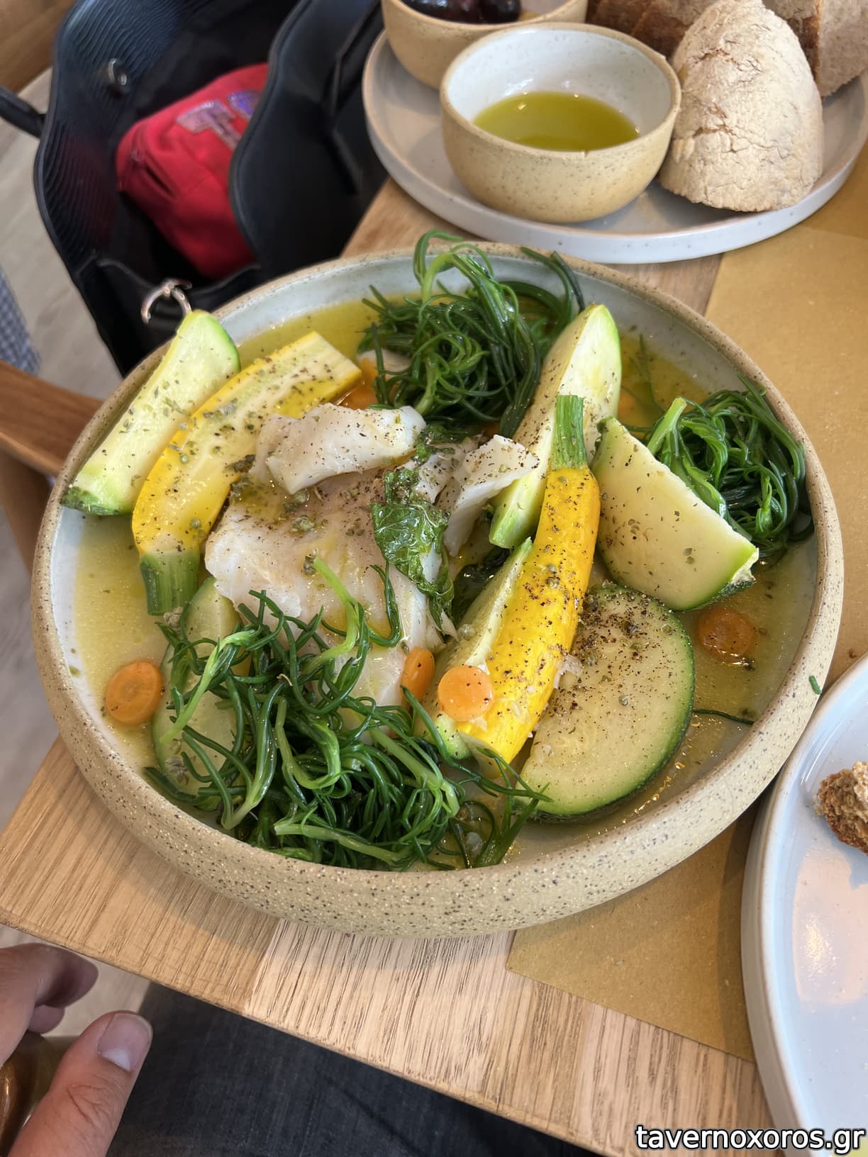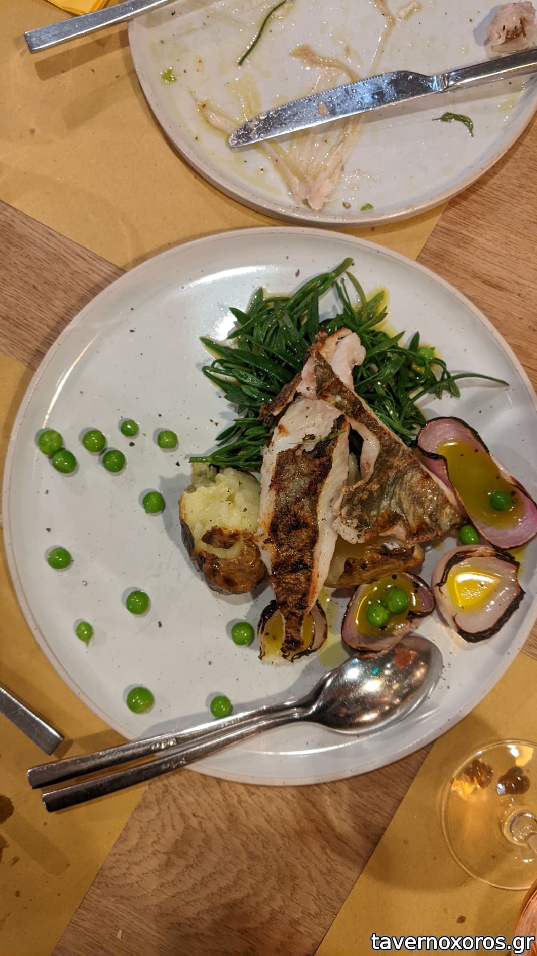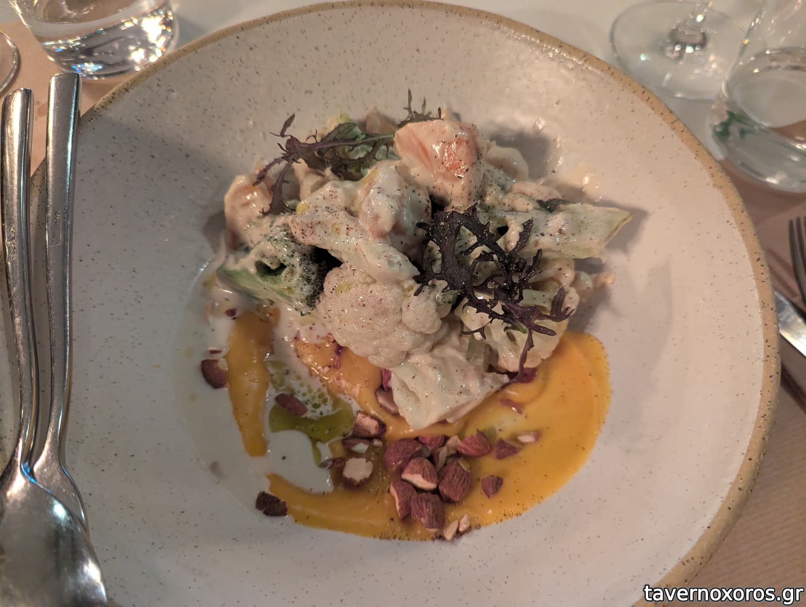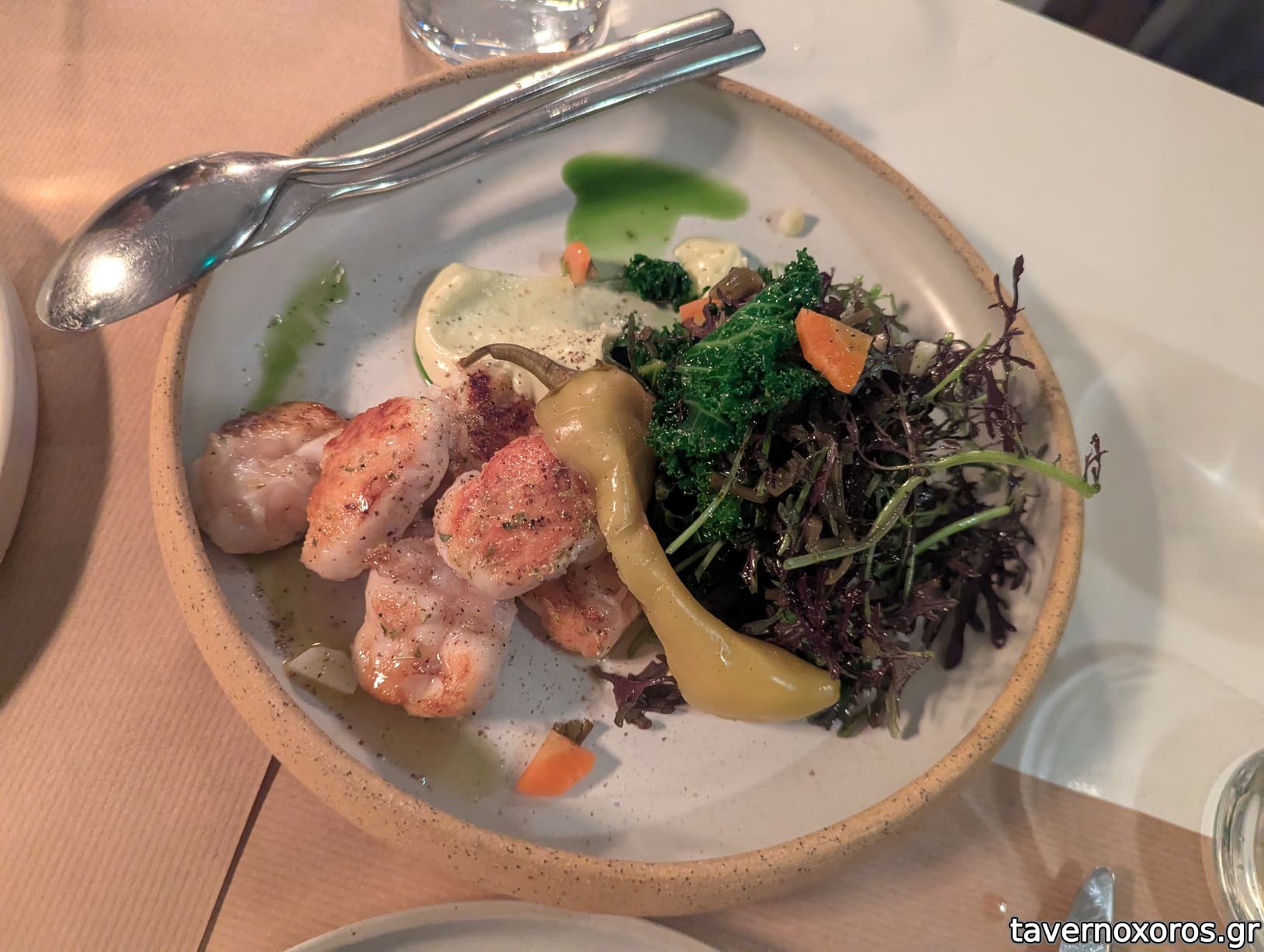 - ένα κυρίως, φιλέτο συναγρίδα με καμένα λαχανικά, αγουρέλαιο, κρέμα κολοκύθας: το καμένο μπρόκολο νόστιμο, η πατάτα αδιάφορη, η συναγρίδα νόστιμη αλλά αρκετά σφιχτή (την είχαν παραψήσει ή την είχαν φτιάξει νωρίς). Η κρέμα καλή και έδινε μια υγρασία. Ως πιάτο δεν ήταν κακό, ο συνδαιτημόνας που είχε φάει το σαβόρο το βρήκε φλατ, εγώ πάλι όχι, αλλά δεν ήταν κανένα τρομερά εμπνευσμένο πιάτο.