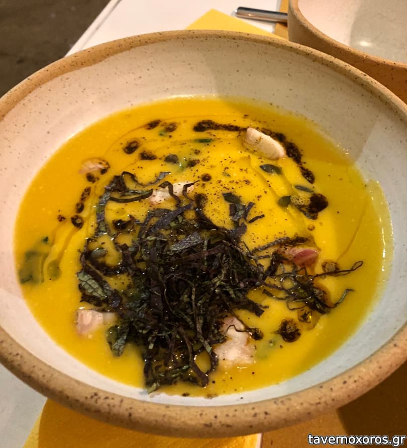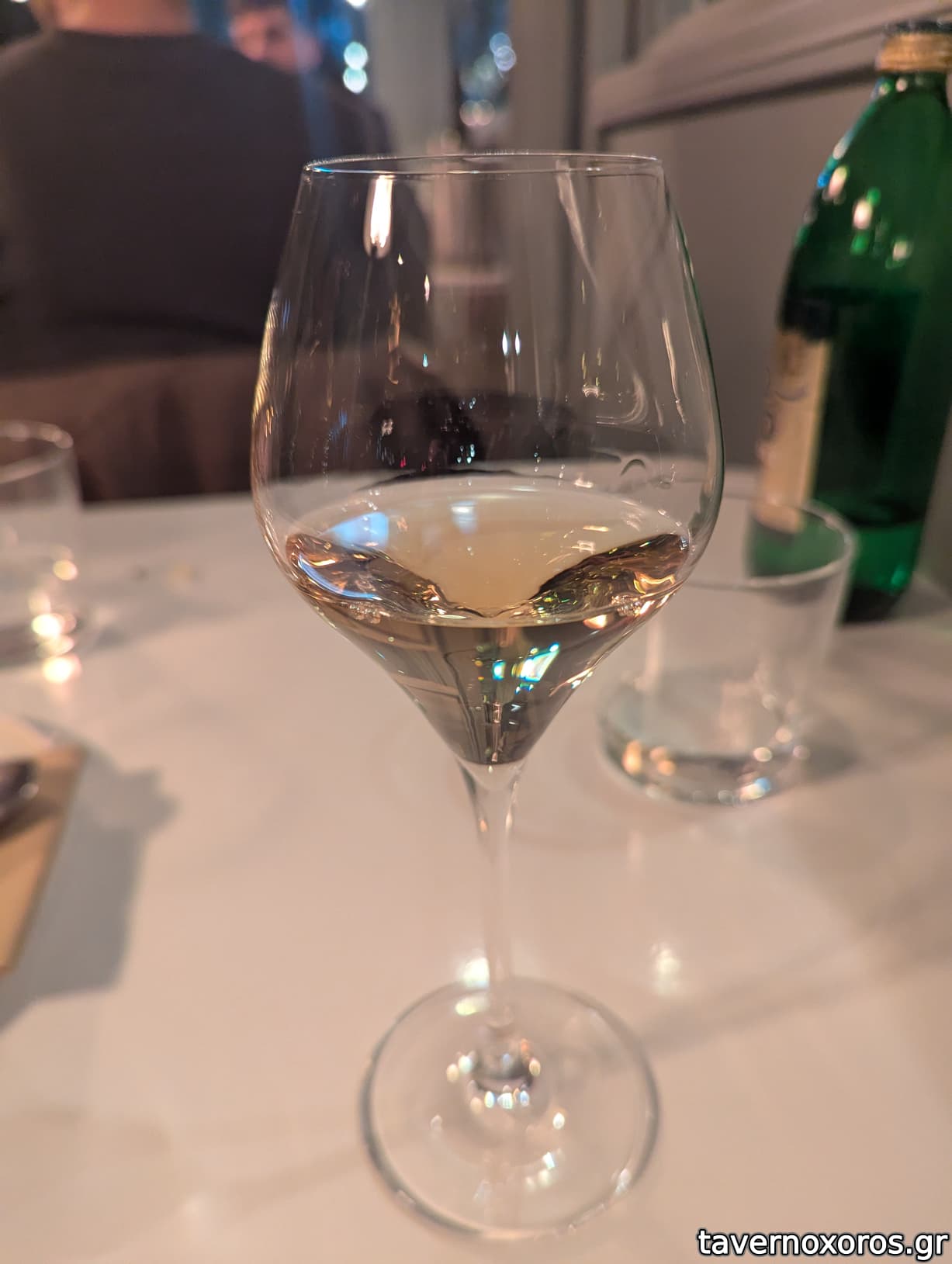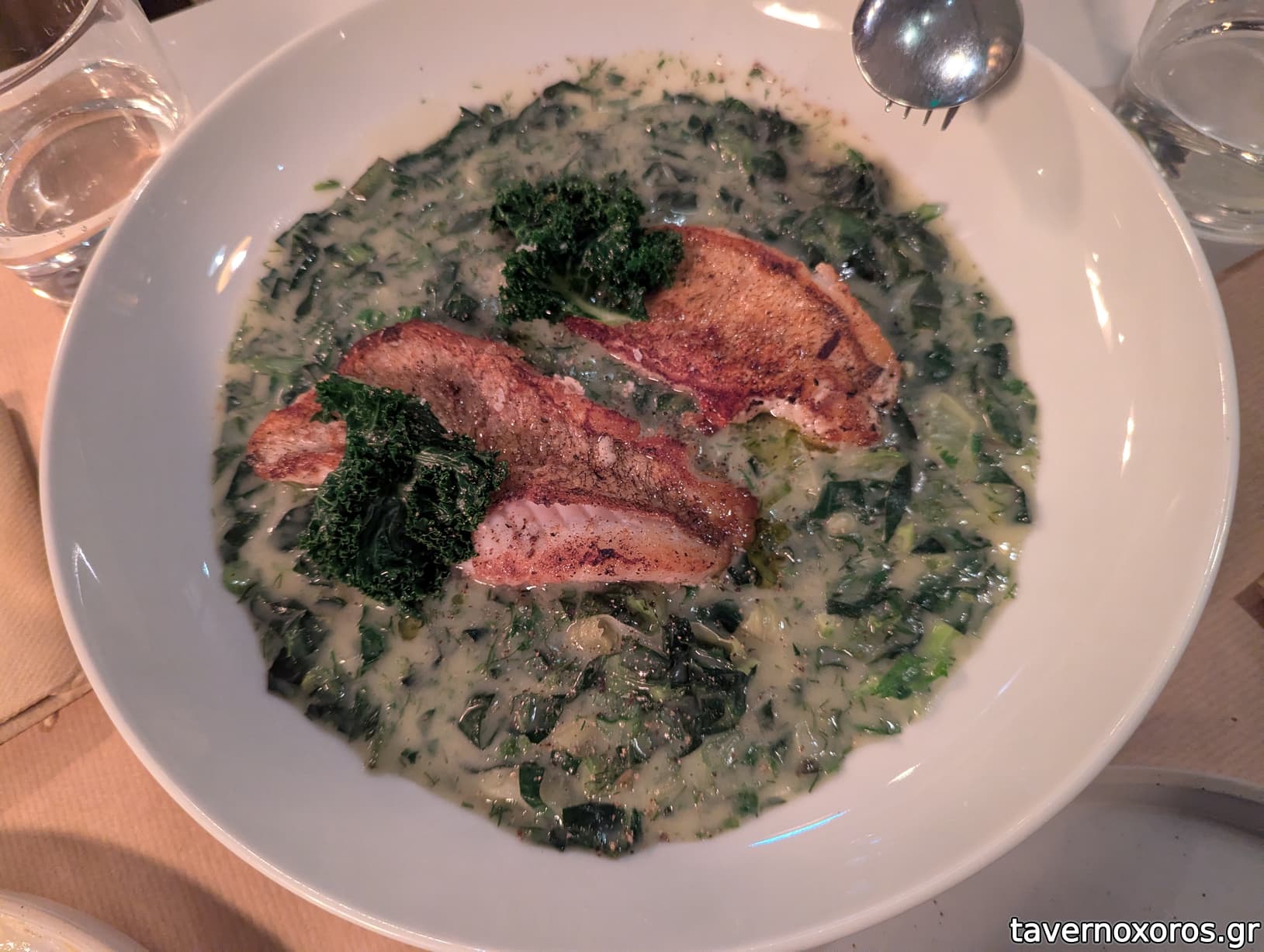 - ένα κυρίως, φιλέτο συναγρίδα με καμένα λαχανικά, αγουρέλαιο, κρέμα κολοκύθας: το καμένο μπρόκολο νόστιμο, η πατάτα αδιάφορη, η συναγρίδα νόστιμη αλλά αρκετά σφιχτή (την είχαν παραψήσει ή την είχαν φτιάξει νωρίς). Η κρέμα καλή και έδινε μια υγρασία. Ως πιάτο δεν ήταν κακό, ο συνδαιτημόνας που είχε φάει το σαβόρο το βρήκε φλατ, εγώ πάλι όχι, αλλά δεν ήταν κανένα τρομερά εμπνευσμένο πιάτο.