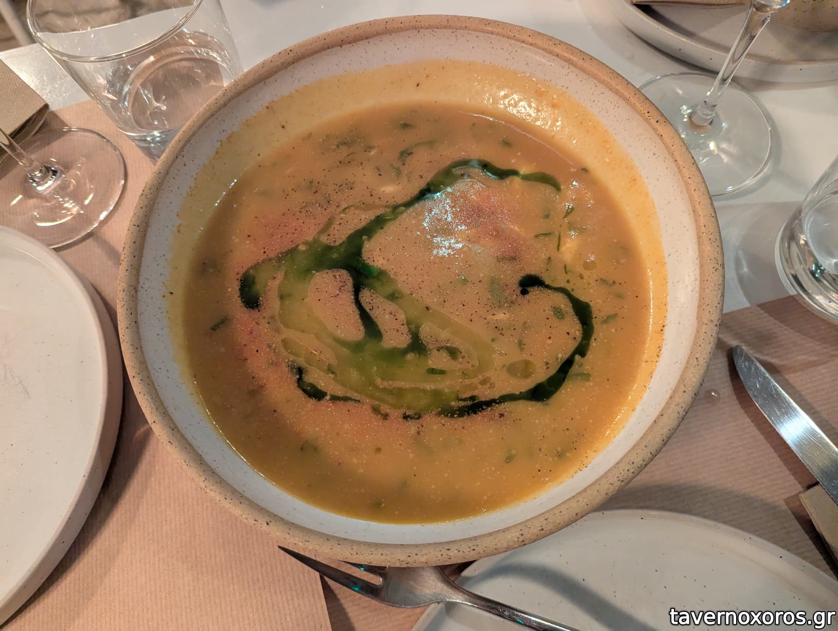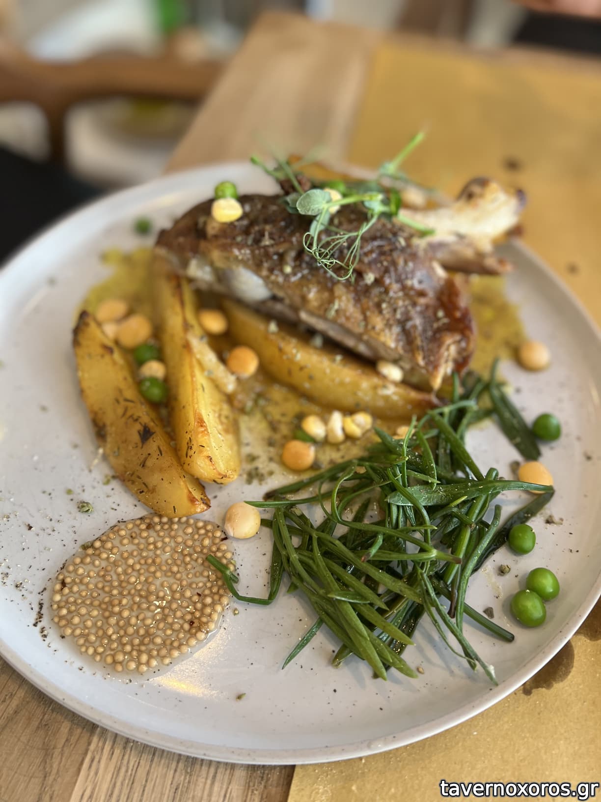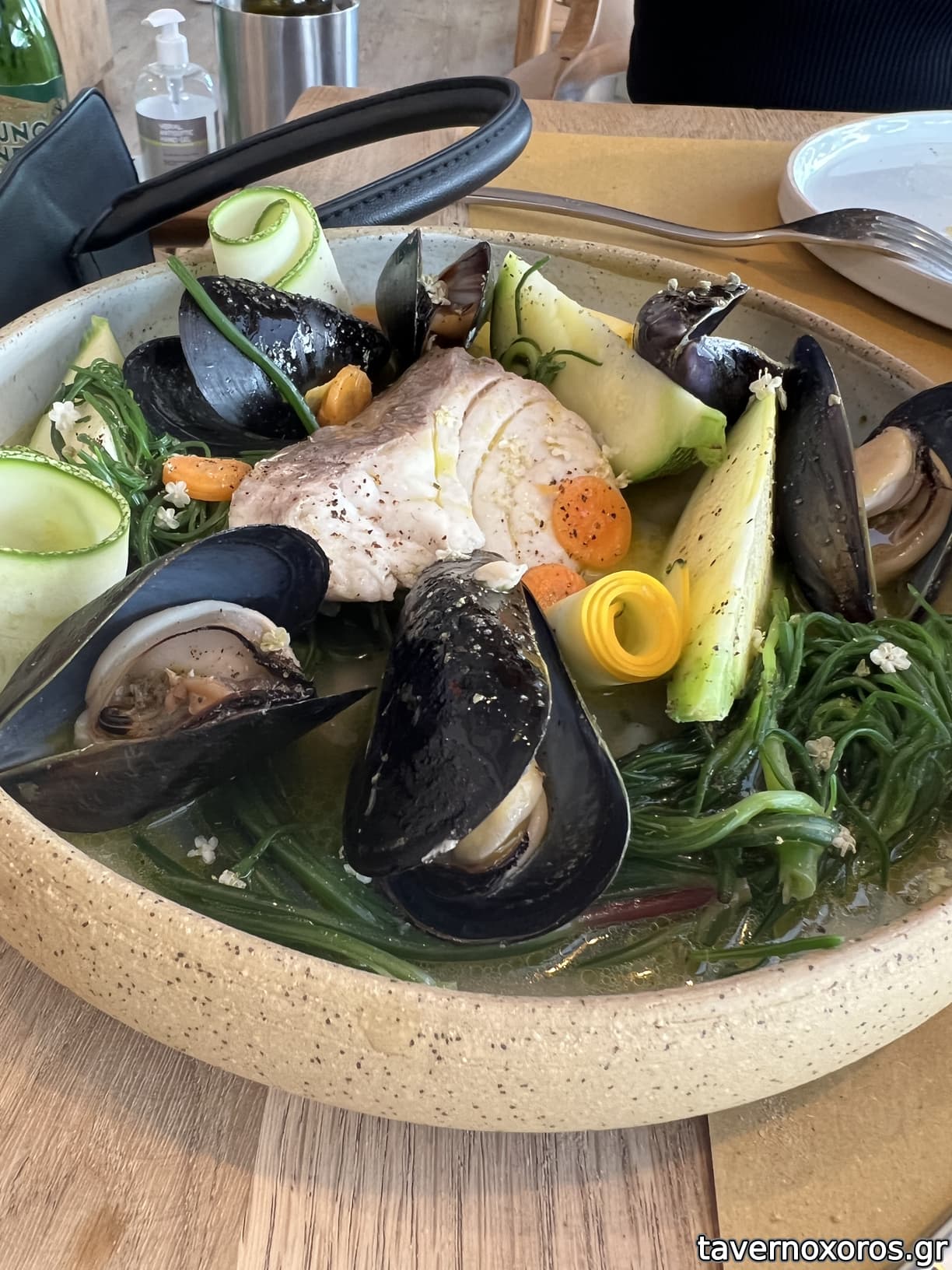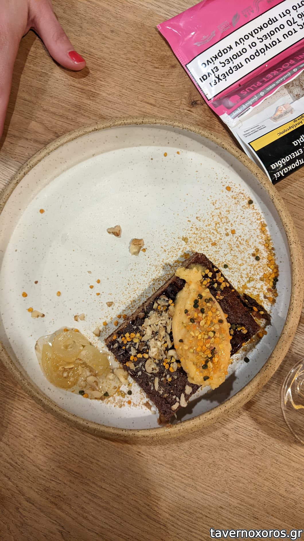 - ένα κυρίως, φιλέτο συναγρίδα με καμένα λαχανικά, αγουρέλαιο, κρέμα κολοκύθας: το καμένο μπρόκολο νόστιμο, η πατάτα αδιάφορη, η συναγρίδα νόστιμη αλλά αρκετά σφιχτή (την είχαν παραψήσει ή την είχαν φτιάξει νωρίς). Η κρέμα καλή και έδινε μια υγρασία. Ως πιάτο δεν ήταν κακό, ο συνδαιτημόνας που είχε φάει το σαβόρο το βρήκε φλατ, εγώ πάλι όχι, αλλά δεν ήταν κανένα τρομερά εμπνευσμένο πιάτο.