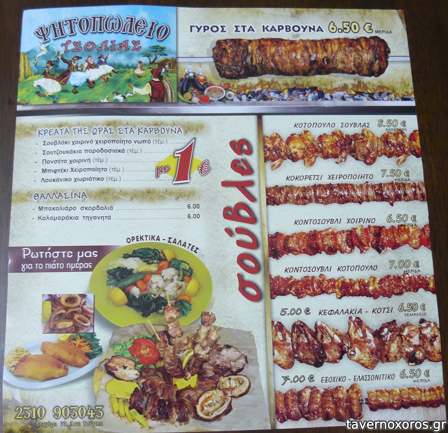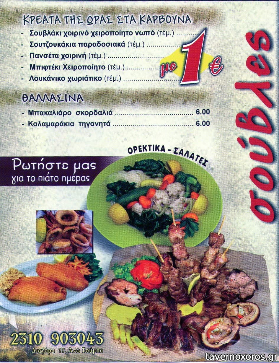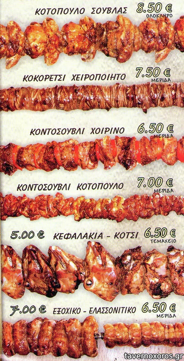 Δοκιμάσαμε γύρο σούβλας (άθλιος - στα όρια της δηλητηρίασης - σίγουρα ημερών), χοιρινό κοντοσούβλι (αποδεκτό) και κοντοσούβλι κοτόπουλο (καλό - οπωσδήποτε άνω του μετρίου). Το μέγεθος των μερίδων αποδεκτό για την τιμή τους (€7 κατά μέσο όρο έκαστη). Οι πατάτες προκάτ. Από σαλάτες τζατζίκι (προκάτ - μεγάλη μερίδα) και πικάντικη (αρκετά καλή - μεγάλη μερίδα) με €2,