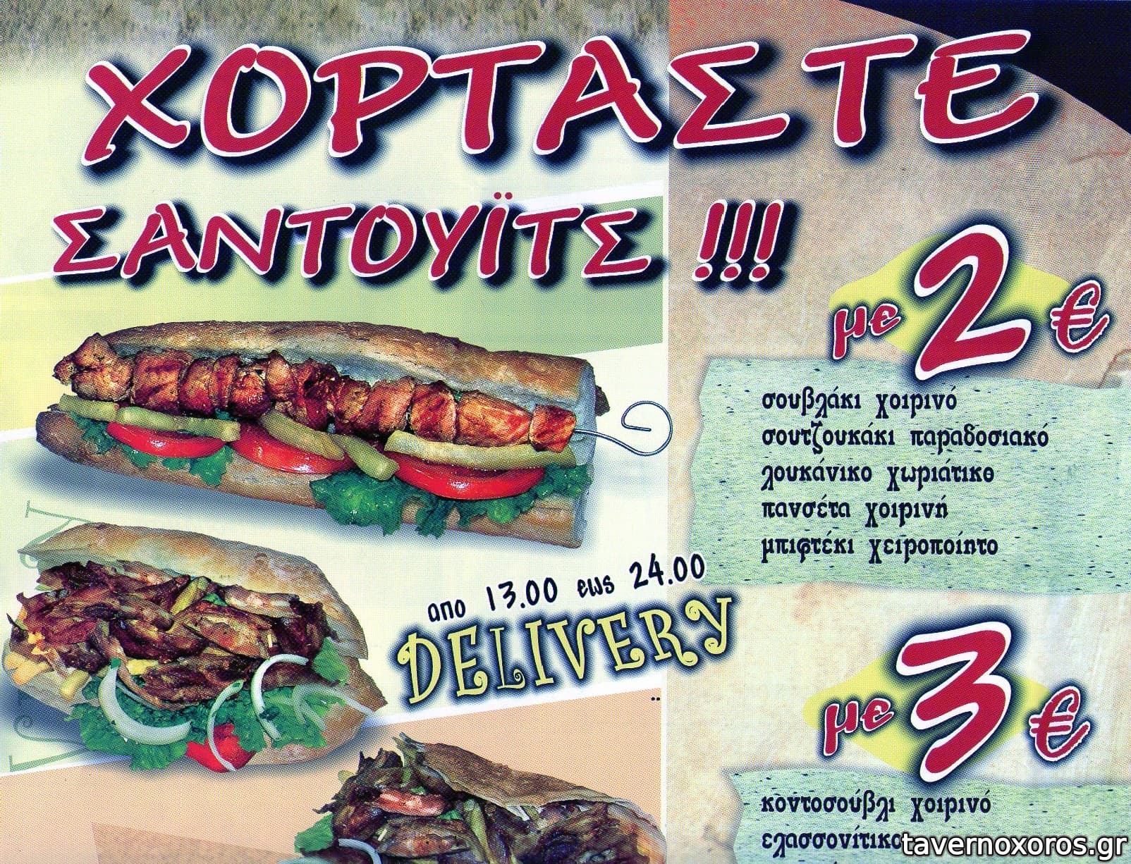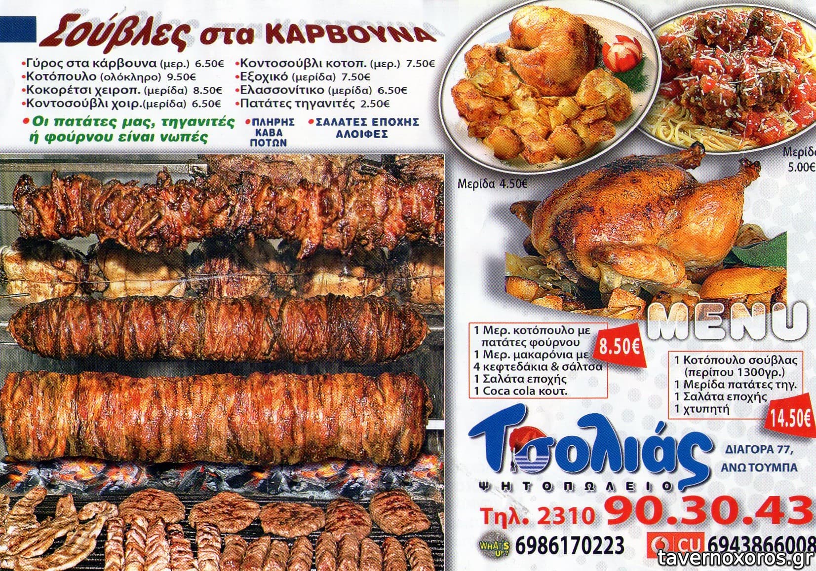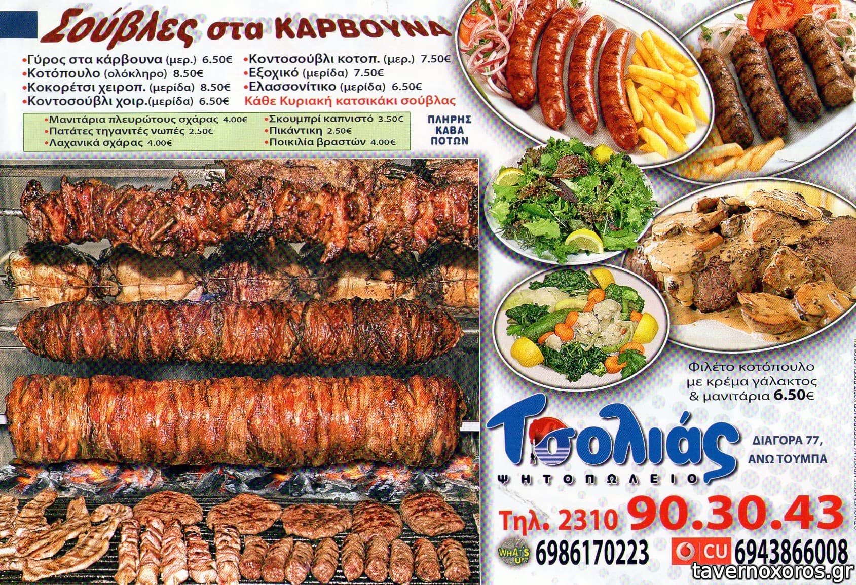 Δοκιμάσαμε γύρο σούβλας (άθλιος - στα όρια της δηλητηρίασης - σίγουρα ημερών), χοιρινό κοντοσούβλι (αποδεκτό) και κοντοσούβλι κοτόπουλο (καλό - οπωσδήποτε άνω του μετρίου). Το μέγεθος των μερίδων αποδεκτό για την τιμή τους (€7 κατά μέσο όρο έκαστη). Οι πατάτες προκάτ. Από σαλάτες τζατζίκι (προκάτ - μεγάλη μερίδα) και πικάντικη (αρκετά καλή - μεγάλη μερίδα) με €2,