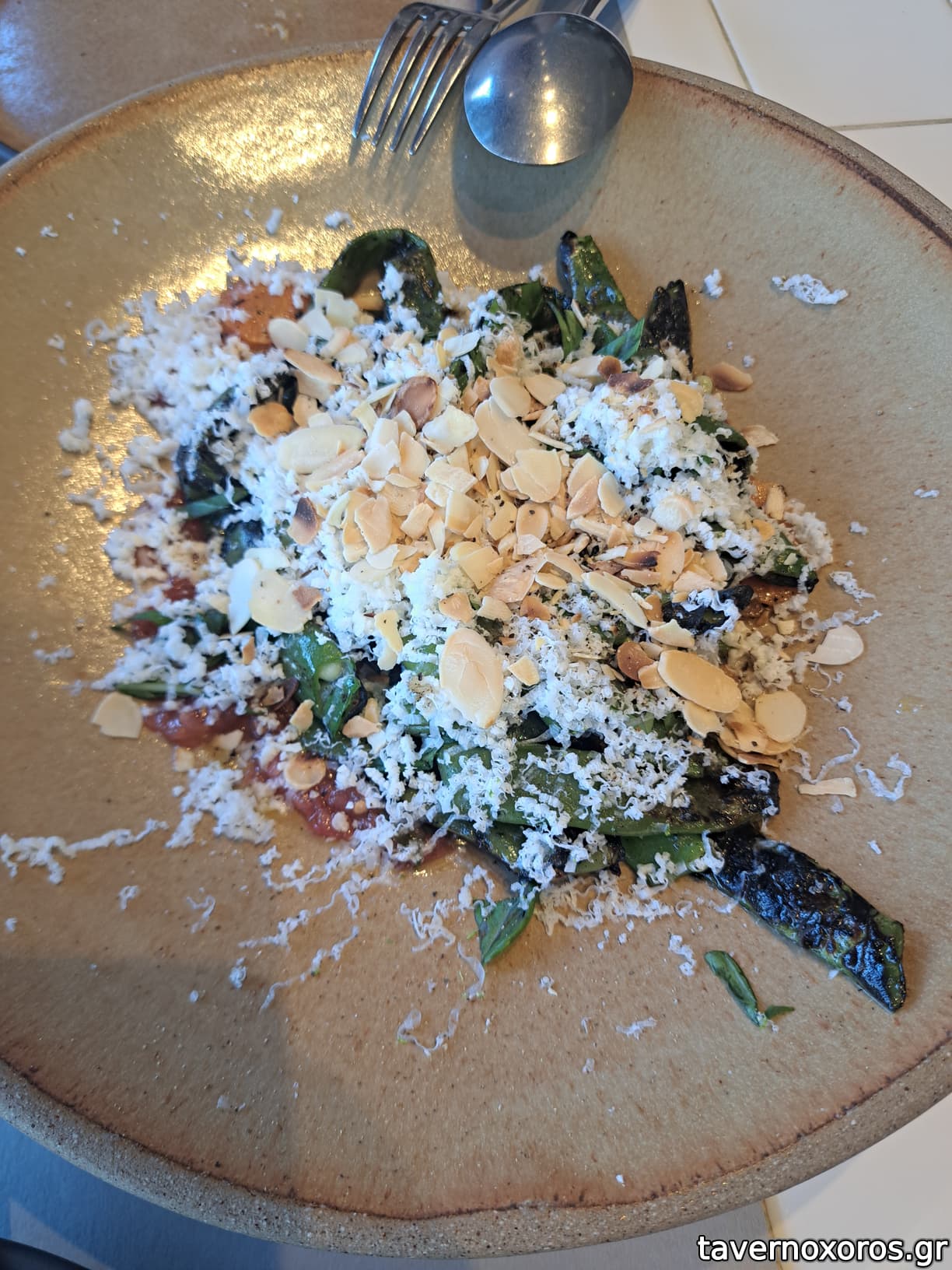 Σαλάτα με φασολάκια, ντομάτα, τυρί, αμύγδαλα - καλή αλλά μικρή. Φασολάκια και ντομάτα είναι, βάλε κι άλλο βρε μάστορα.