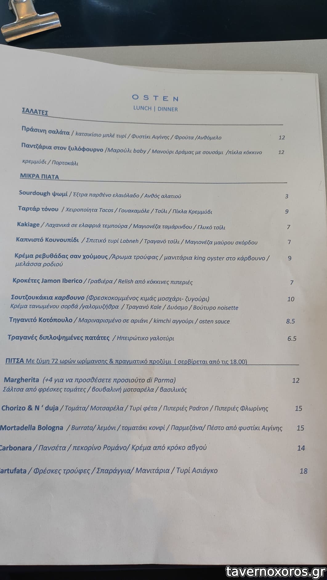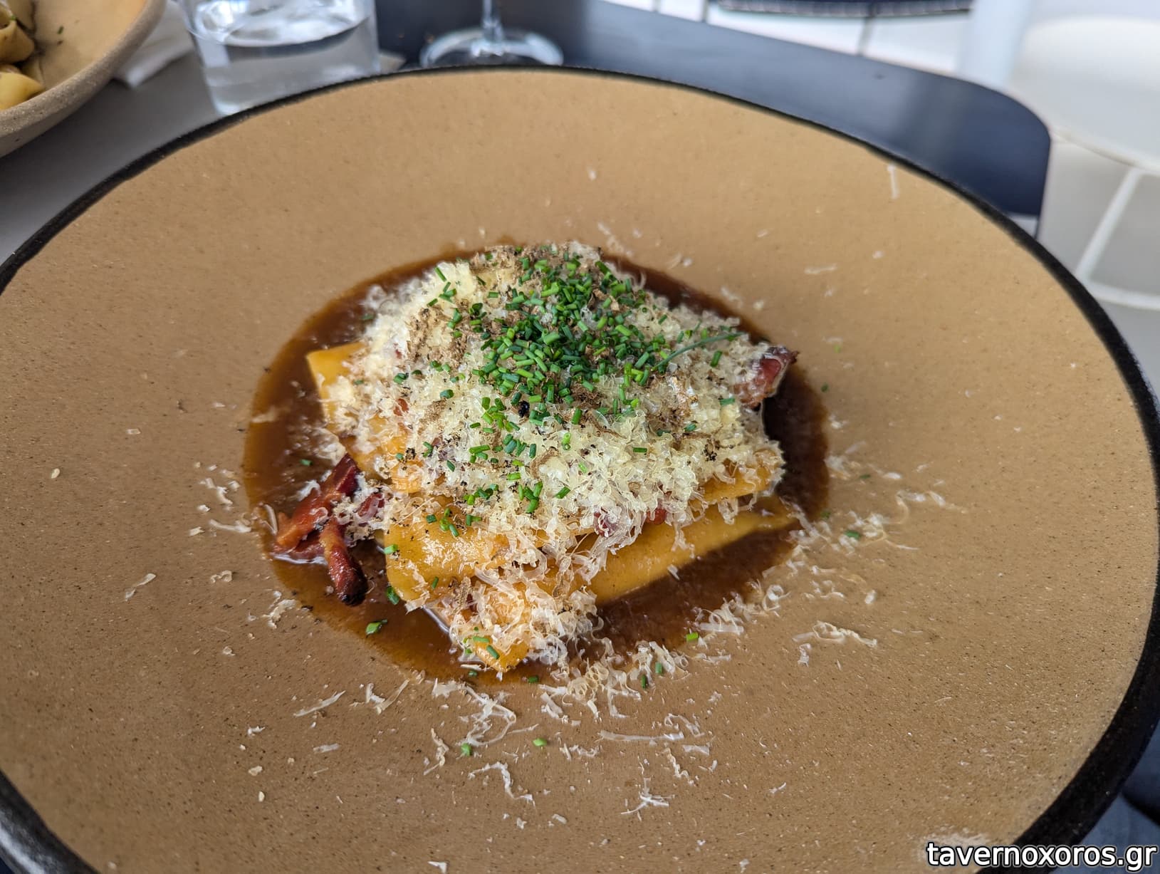 "Agnolotti γεμιστά με κρέμα γλυκοπατάτα / γκούντα 36 μηνών παλαίωσης / καπνιστή πανσέτα / φρέσκια τρούφα" (πολύ νόστιμο, 16€)