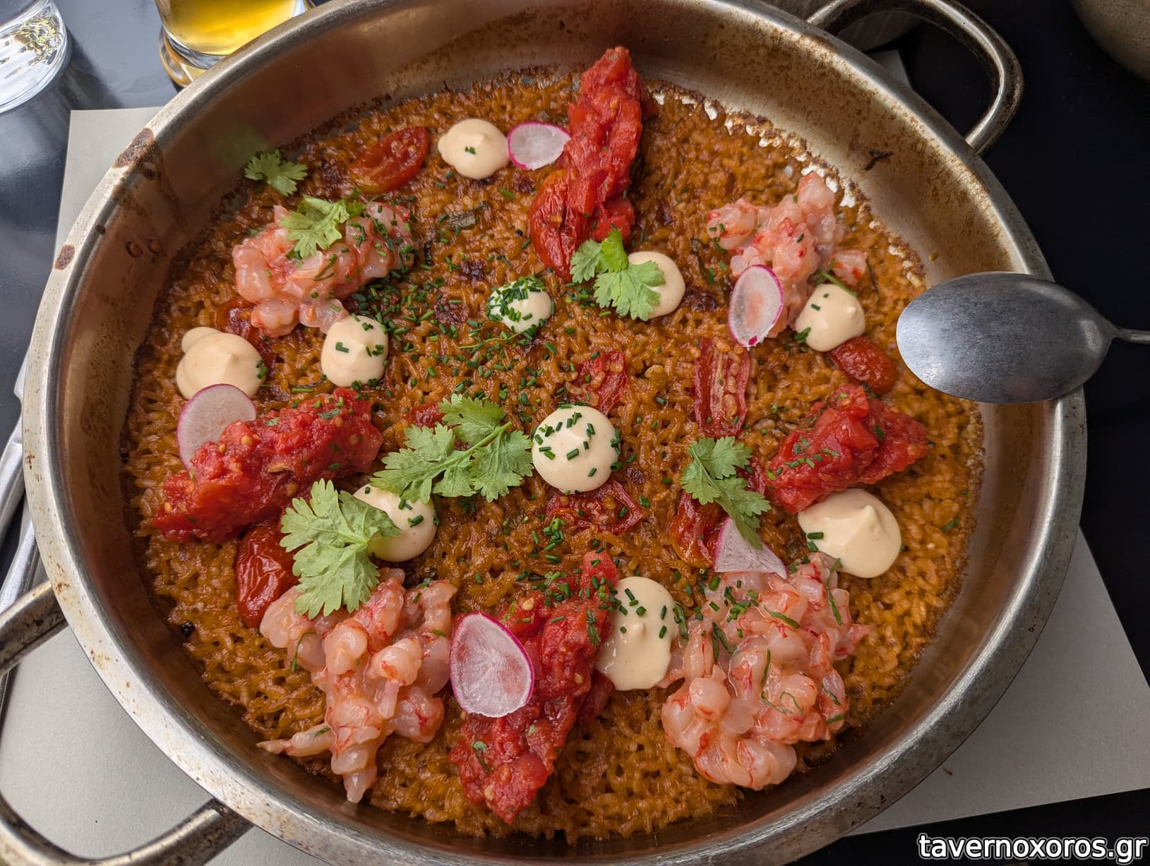 "Ντοματόρυζο στον ξυλόφουρνο / γαρίδα κοιλάδος ceviche / sriracha" (μια χαρά, όμως 25€)