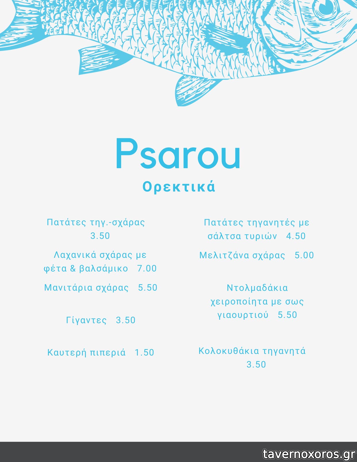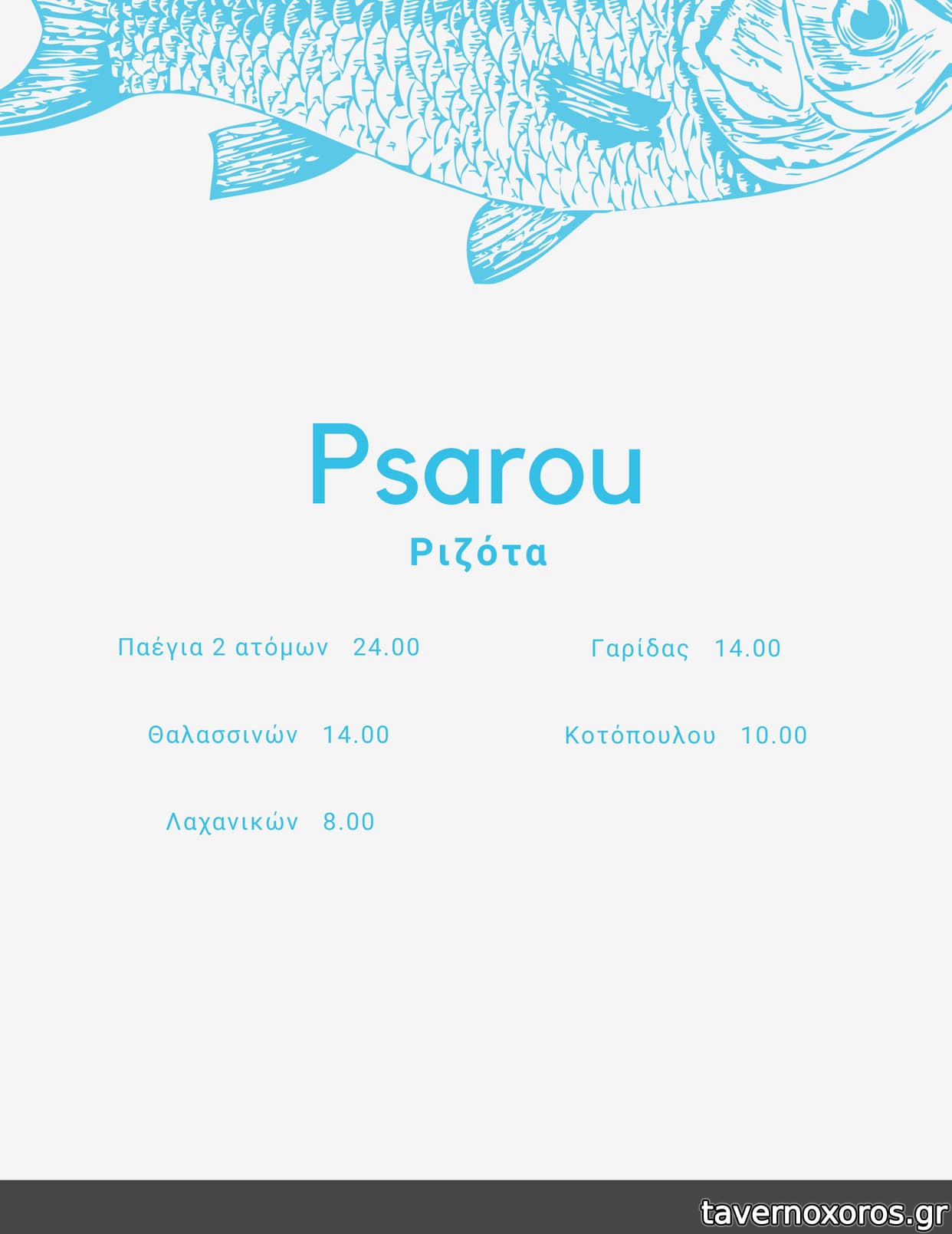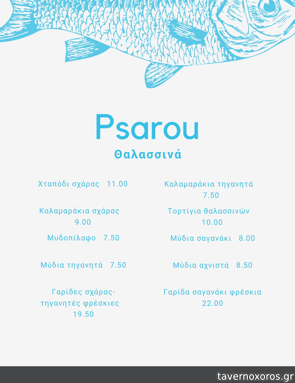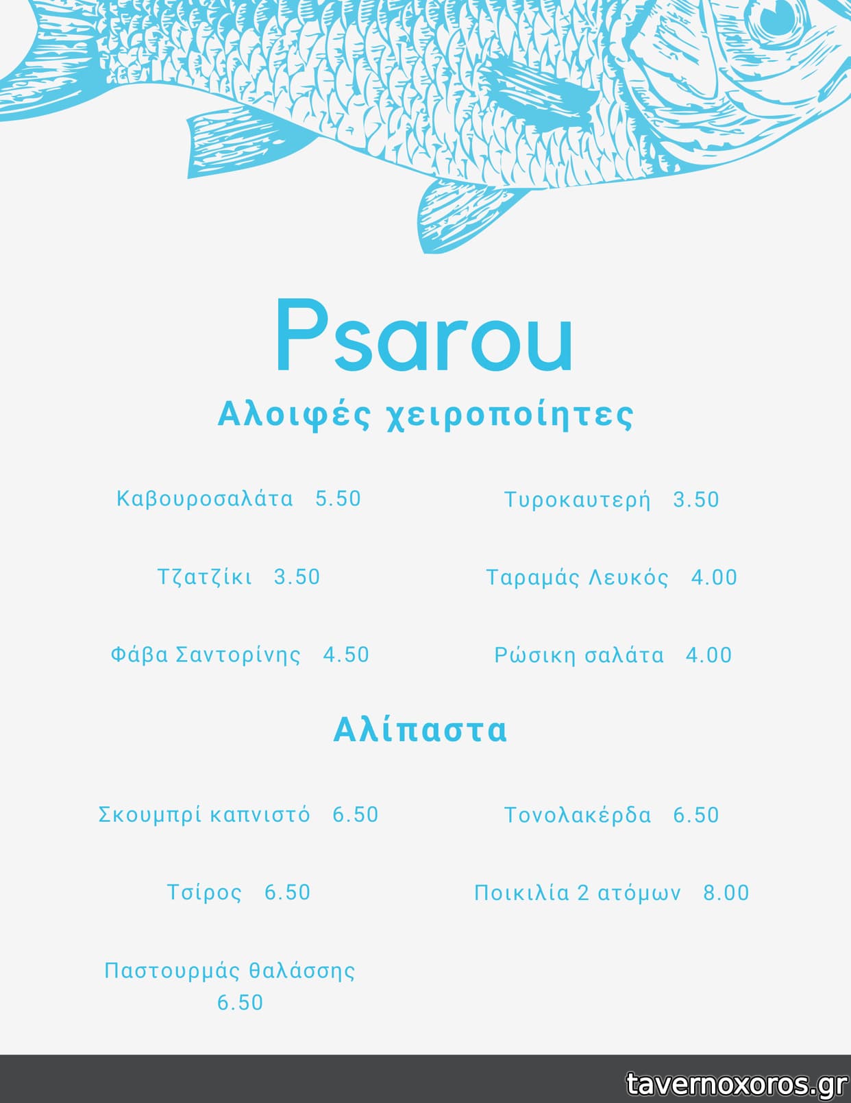 Γενικά η Τούμπα δεν έχει δυνατές ψαροταβέρνες και η Ψαρού ανήκει στις αξιοπρεπείς περιπτώσεις. Άμα έχετε παιδιά προτείνεται ανεπιφύλακτα καθώς έχει παιδότοπο με κοπέλα που τα απασχολεί.
