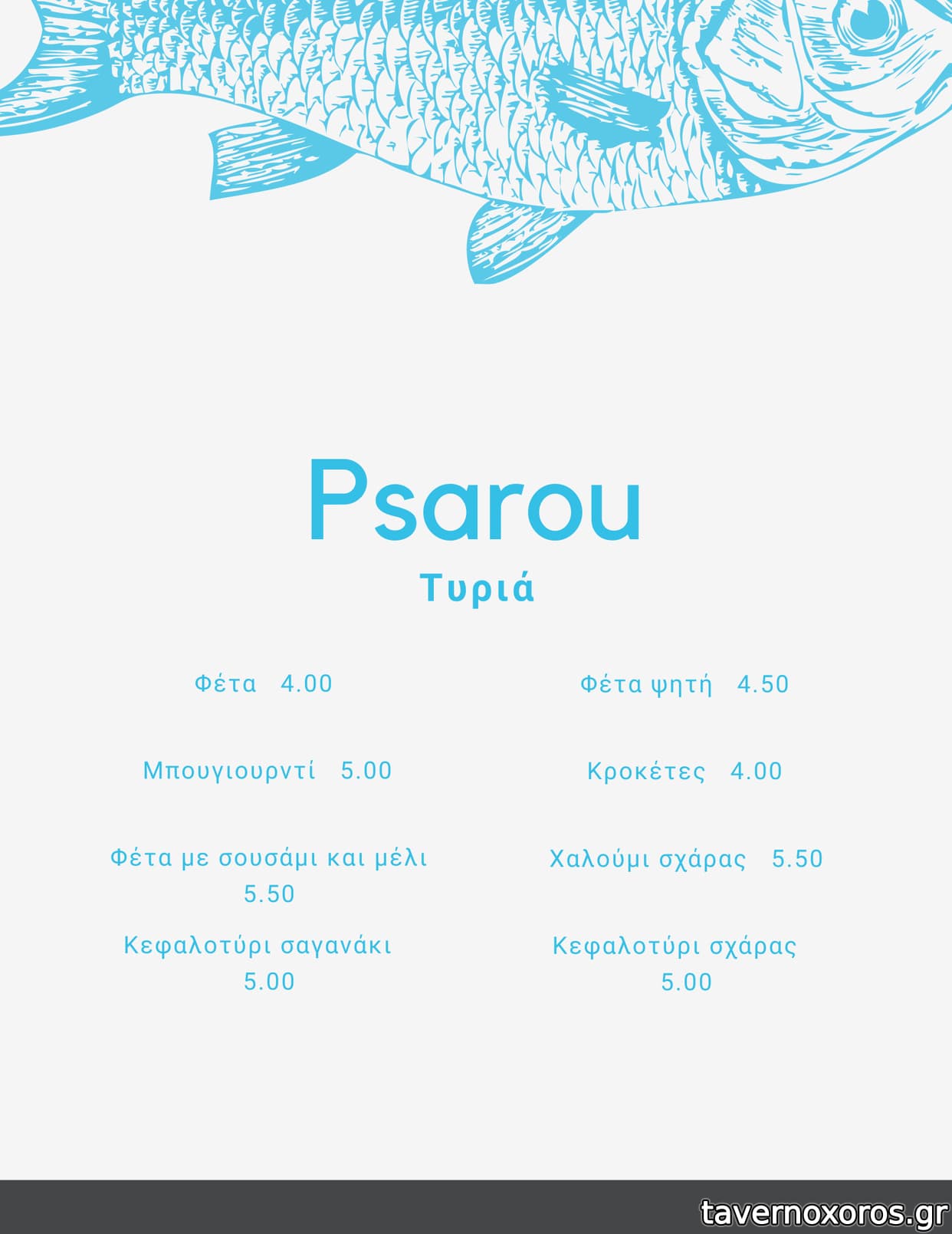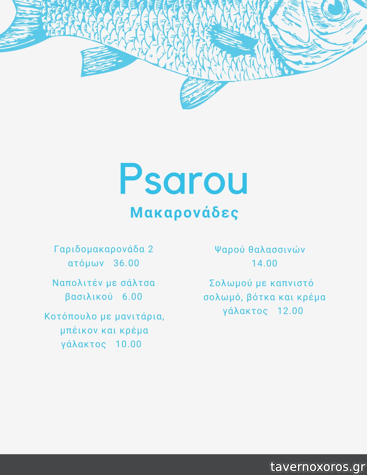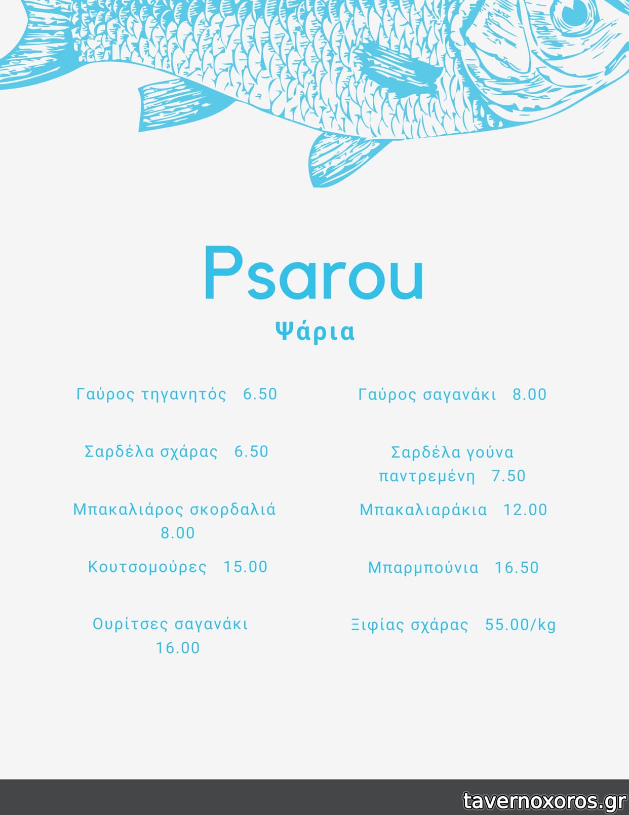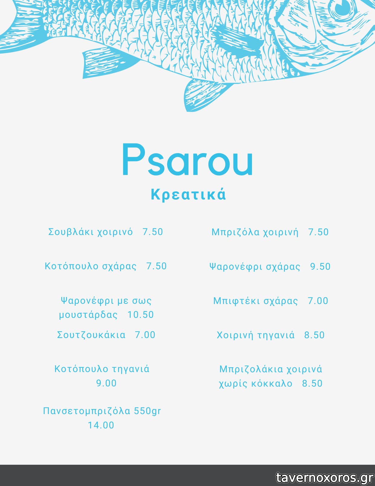 Γενικά η Τούμπα δεν έχει δυνατές ψαροταβέρνες και η Ψαρού ανήκει στις αξιοπρεπείς περιπτώσεις. Άμα έχετε παιδιά προτείνεται ανεπιφύλακτα καθώς έχει παιδότοπο με κοπέλα που τα απασχολεί.