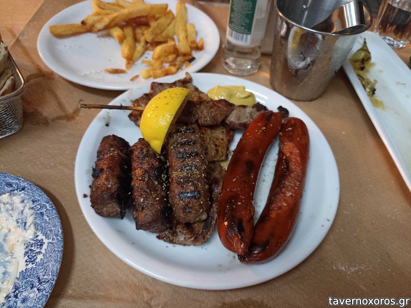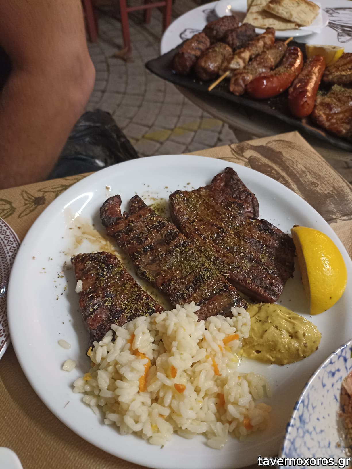 Μερίδα συκώτι (αρκετά καλό), και στο βάθος τεμάχια (νέα: μπριζολάκι οκ, σουβλάκι κότα συμπαθητικό)