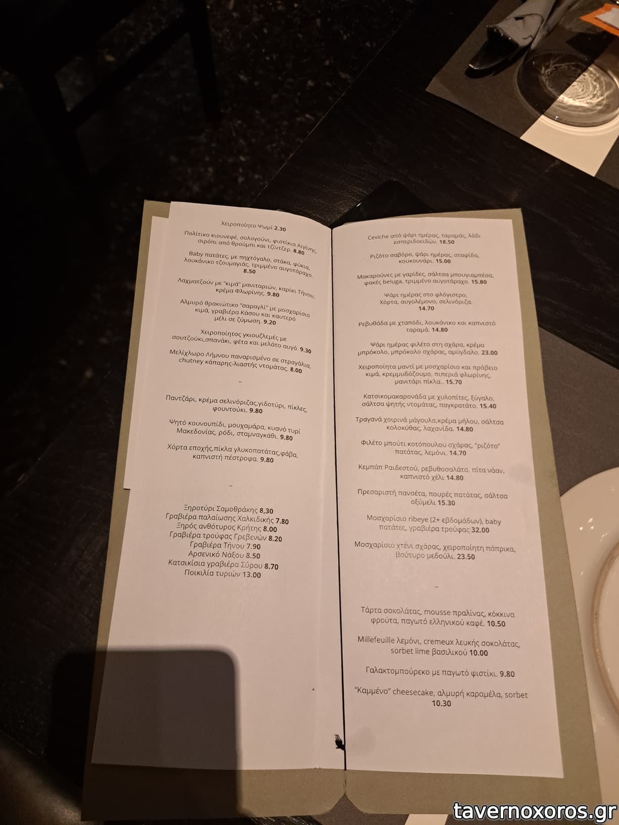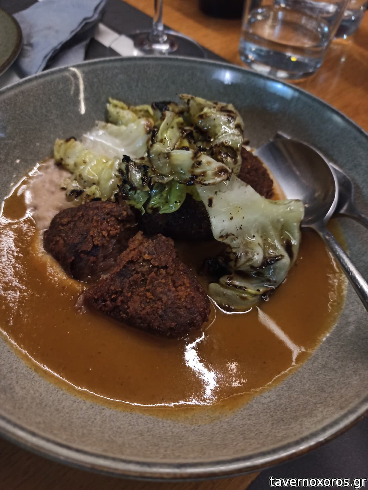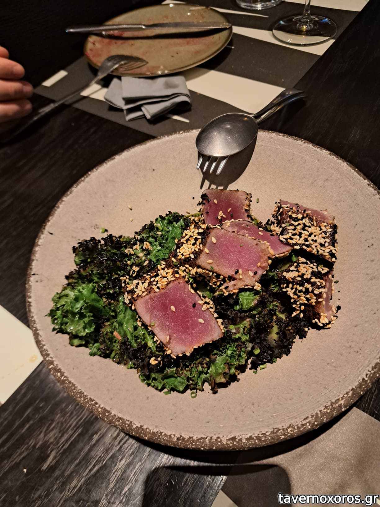 Έτσι, άλλα ήταν νόστιμα (ρεβυθάδα με γαρίδες και ταραμά / κατσικομακαρονάδα) μα χωρίς θετικές εκπλήξεις, κι άλλα διεκπεραιτωτικά του fine-dine φαντασιακού που δεν ανταπεξήλθαν στις προσδοκίες (λαχανοντολμάς με μαύρο χοίρο, ξινόχοντρο και τζατζίκι / λαχματζούν με παστουρμά θαλάσσης). Ένα ήταν πραγματικά ασύνδετο και αδιάφορο (μαγιάτικο στη σχάρα με σφουγγάτο και τζατζίκι), κι ένα που μας άρεσε πολύ (θρακιώτικο "