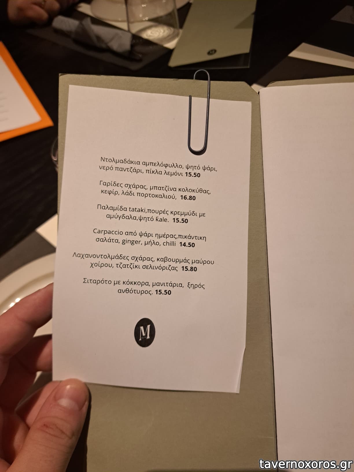 Καρπάτσιο μηλοκόπι (πιάτο ημέρας) εξαιρετικό, arancini ΟΚ, πατάτες baby με στάκα ΟΚ, μαντί ΤΕΛΕΙΑ, πανσέτα πρεσαριστή πολύ καλή, ψαρονέφρι ωραίο, μακαρονάκι με ζυγούρι πολύ καλό, τάρτα με σοκολάτες πολύ καλή, γαλατόπιτα (γλυκό ημέρας) ωραία ιδέα και γευστική στο σύνολο, αλλά θέλει δουλειά ακόμα το πιάτο για να στρώσει.