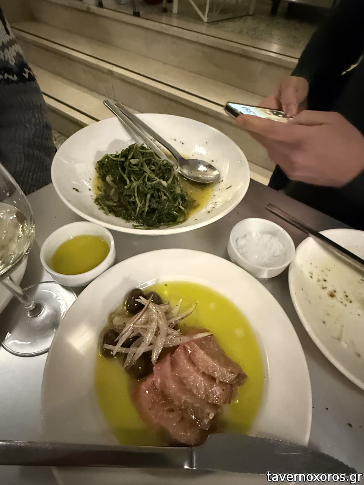 Οταν ήρθε η σερβιτορα να παρει παραγγελια, μας γνωστοποιησε ότι δεν υπηρχαν ηδη δυο ειδη απο την καρτα, πραγμα αδιανοητο για 9 η ωρα το βραδυ σε γεματο εστιατοριο. Οι τιμες εριστικα κι αδικσιολογητα ακριβες για κατι που δεν παιρνεις αισθηση απο την πρωτη εντυπωση οτι εχει value (πχ κοτοπουλο με μανιταρια 28 ευρω). Δωσαμε συνολικα 76 ευρω για ένα ξυνο νερο, ενα κοκορέτσι, μια σαλάτα με ντοματίνια και ένα πρώτο με μοσχαρισιο ταρτάρ και ξεροτήγανο. Εάν κάναμε κανονική παραγγελία ο λογαριασμος ανετα ξεπερνάει τα 70€ το άτομο χωρίς το κρασί. Μας προσφέρανε διαφορετικες γευσεις απο μπουκιες ψωμι με ενδιαφερουσες γευσεις μαζι με αγουρελαιο κι ανθο αλατιου. Τα σκληροφλουδα ντοματίνια μαζι με 2 φυλα βασιλικού και μια κουταλιά σουπας ασπρο τυρι ήταν πλημμυρισμένα στο λάδι και γευστικα κάτω του μετριου. Το επισης κατω του μετριου ταρταρ μαζι με το ξεροτηγανο δεν ηταν καλα "
