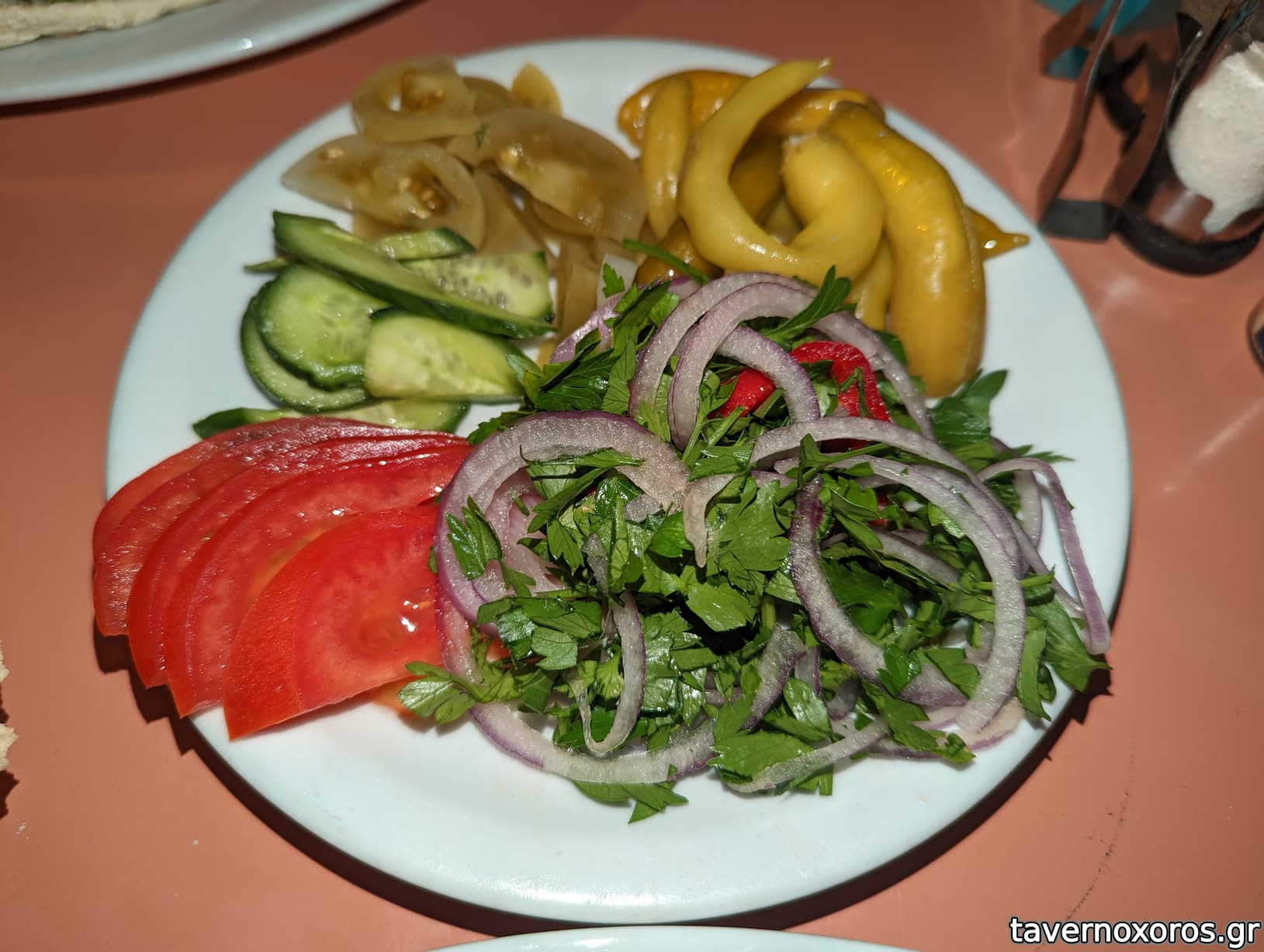 Ελλειπτική επικοινωνία, αλλά βγήκε άκρη γρήγορα. Πήραμε ένα πλατώ με Γύρο Κοτόπουλο και ένα με Αρνίσια κεμπάπ. Και τα δύο ήρθαν με πολλές σαλάτες, όπως μου αρέσει, και ντιπ, για να κάνεις συνέχεια σαντουιτσάκια, σαν tacos! Επίσης μας έφεραν μόνοι τους ένα χούμους και πολλά νερά.