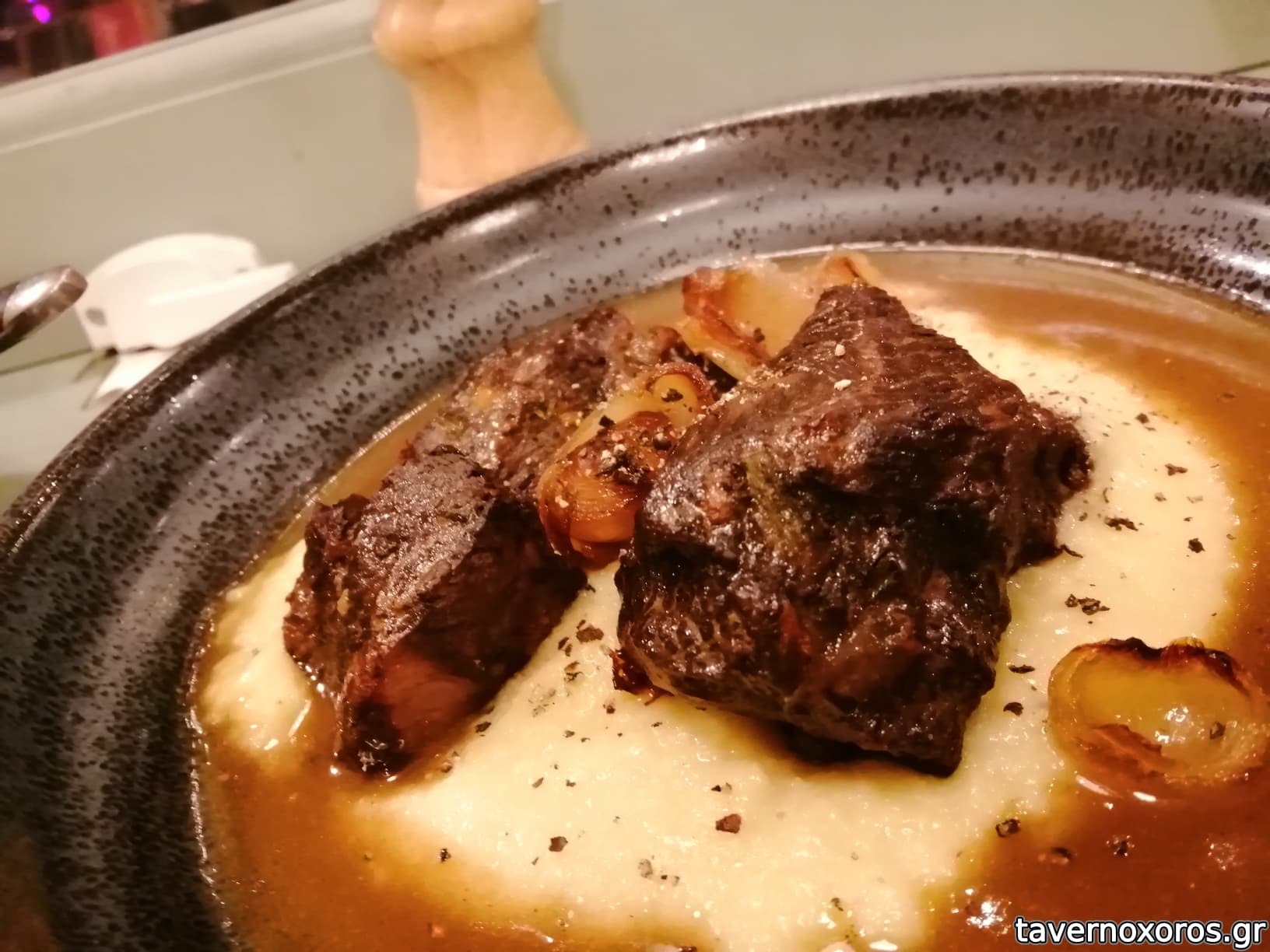 Σιγομαγειρεμένα μοσχαρίσια μάγουλα με πολέντα και παρμεζάνα