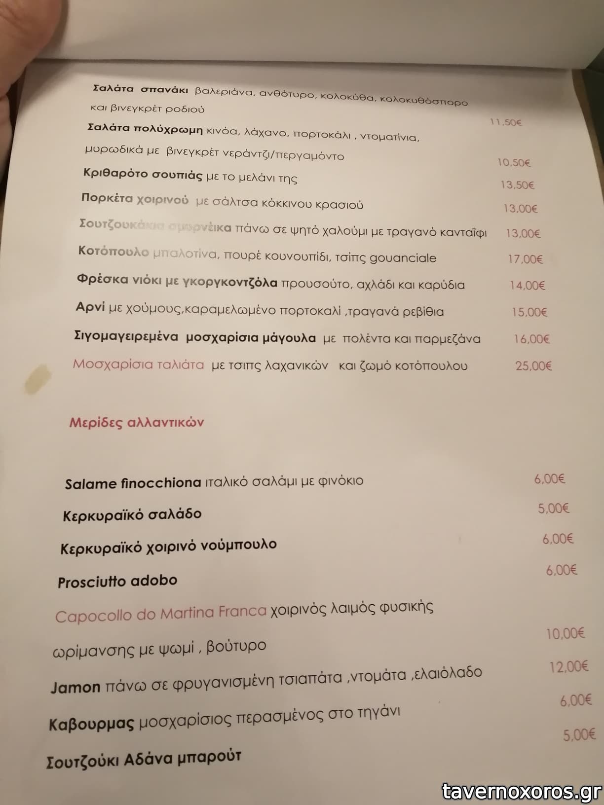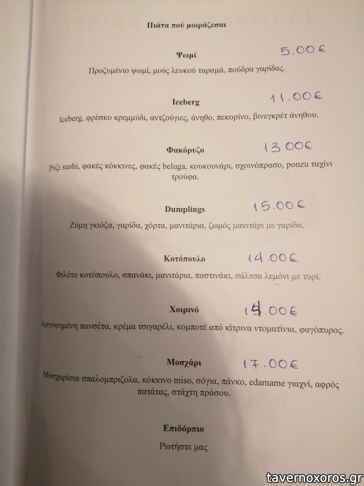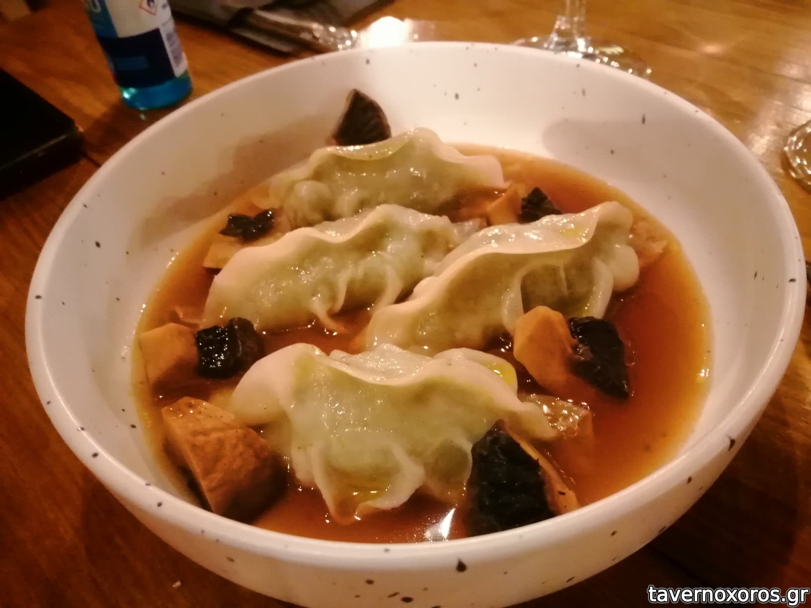 "Ζύμι γκιόζα, γαρίδα, χόρτα, μανιτάρια, ζωμός μανιτάρι με γαρίδα" (15€, απλώς οκ)