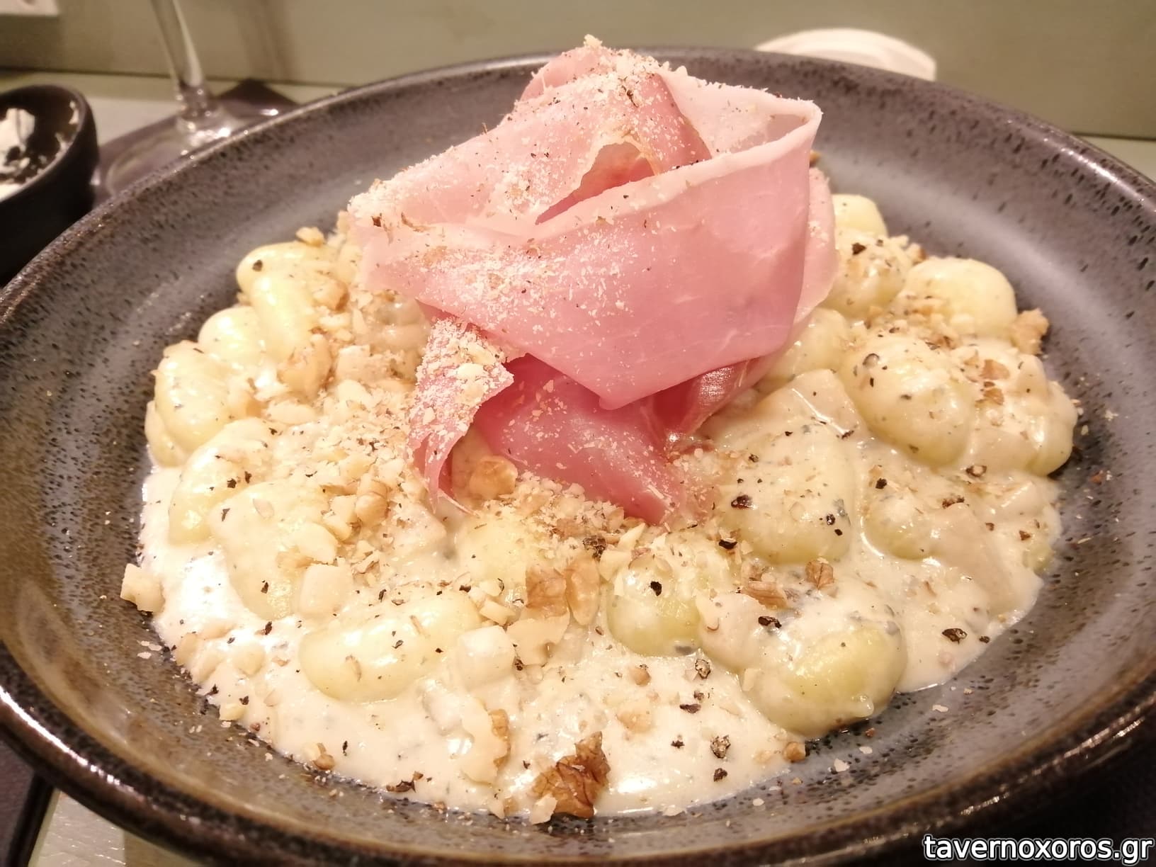 Φρέσκα νιόκι με γκοργκοντζόλα, προσούτο, αχλάδι και καρύδια (οκ)