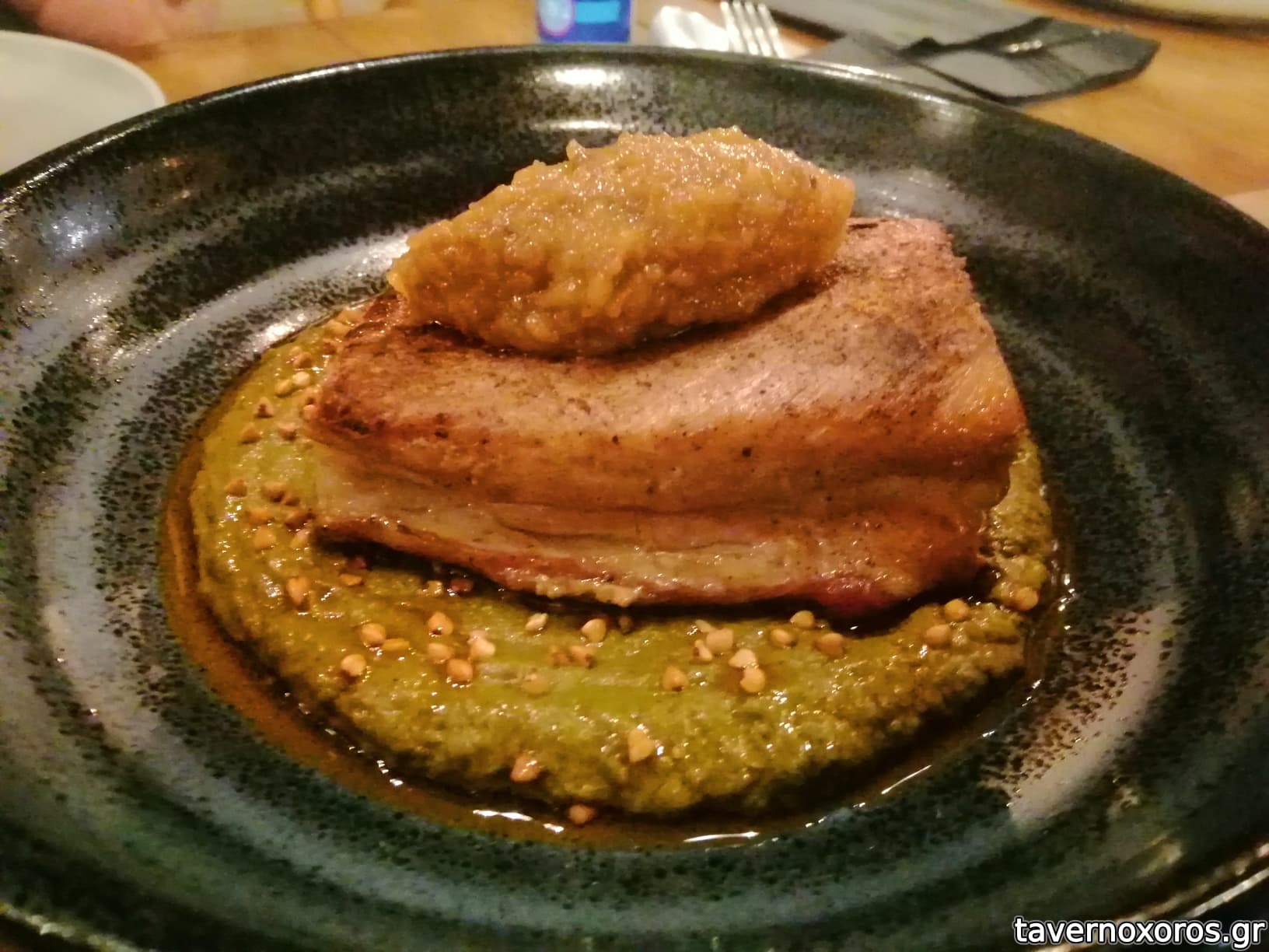 "Αργοψημένη πανσέτα, σεληνόριζα, μαρούλι, σέλινο, σάλτσα φρικασέ" (λουκούμι)