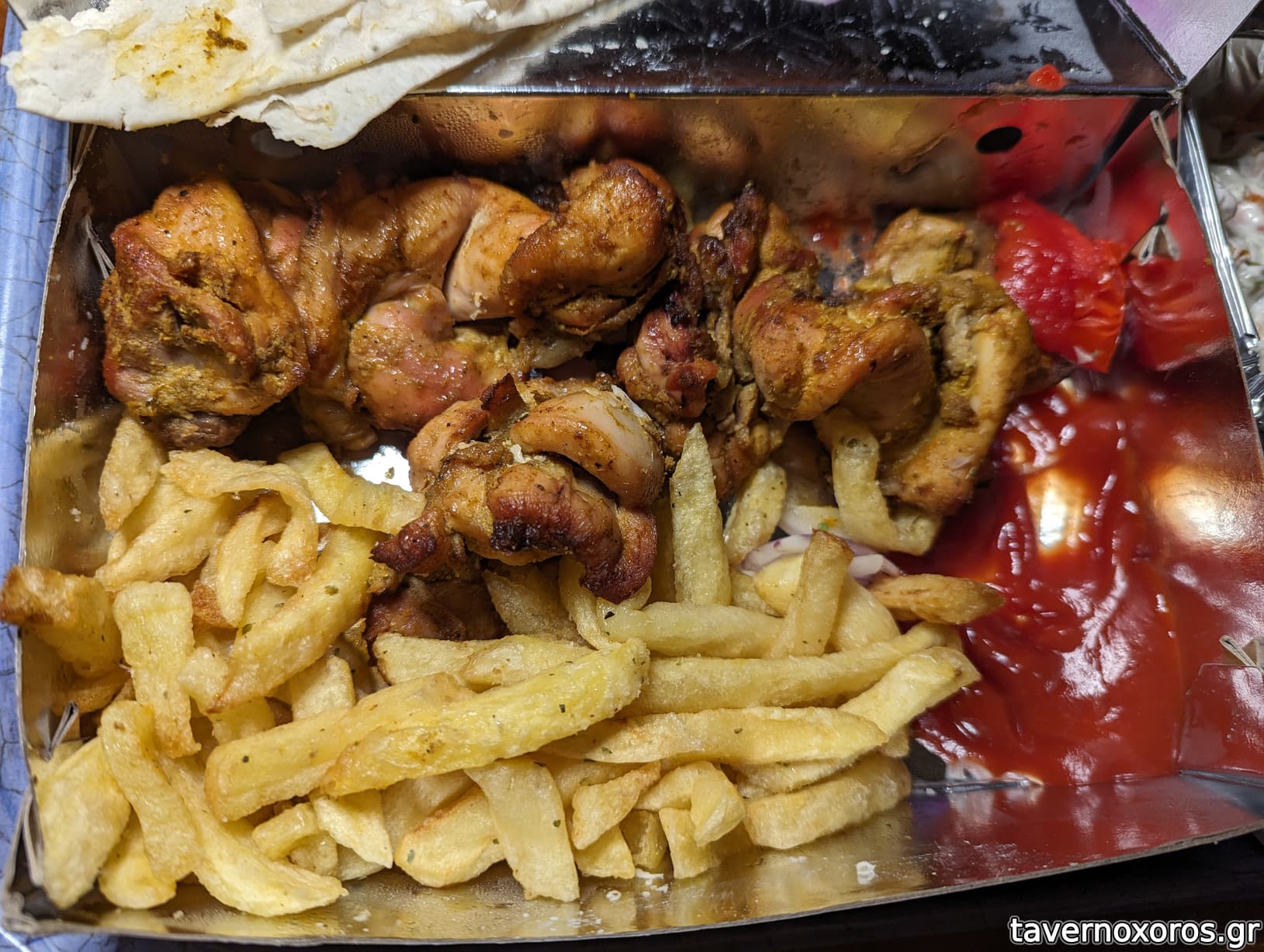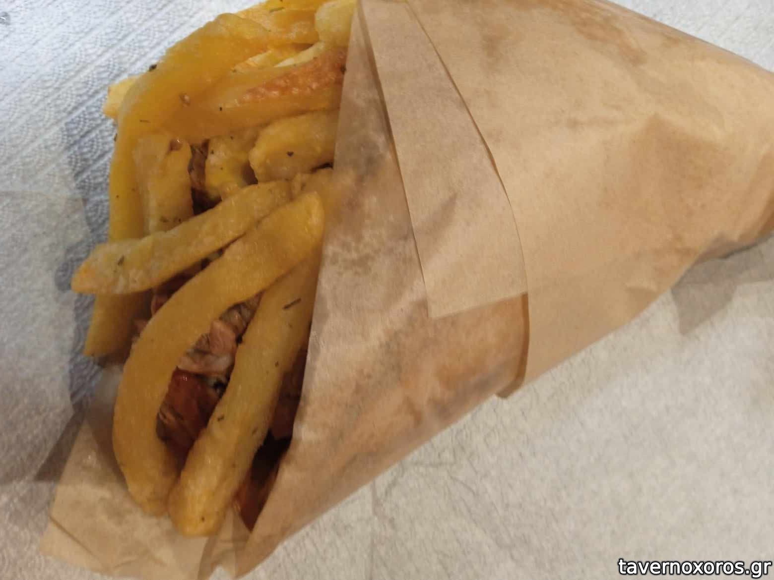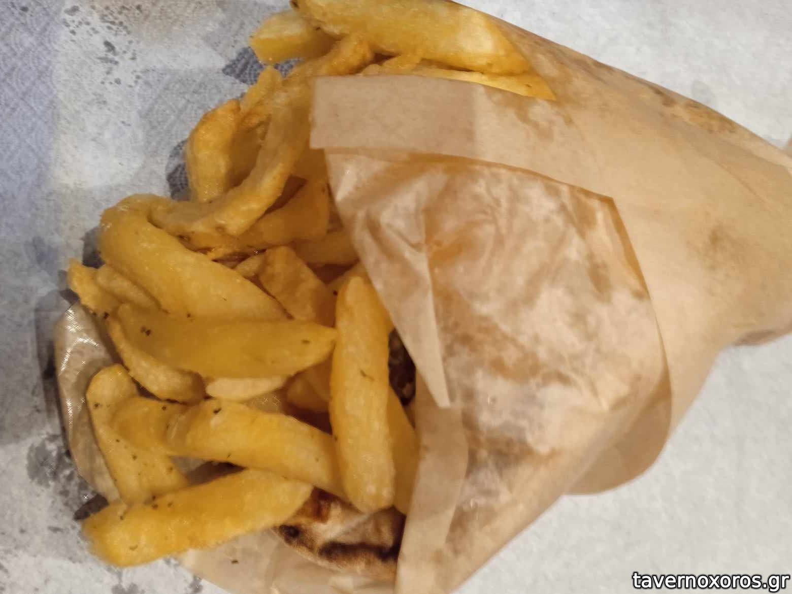 Συνοδεύεται από ψημένη ντομάτα, κρεμυδάκι, λαβάς ή πίτα (ο λαβάς που επέλεξα ήταν γενικά άνοστος) και πατάτες τηγανητές οι οποίες ήταν άνω του μέσου όρου ταβέρνας/γυράδικου.