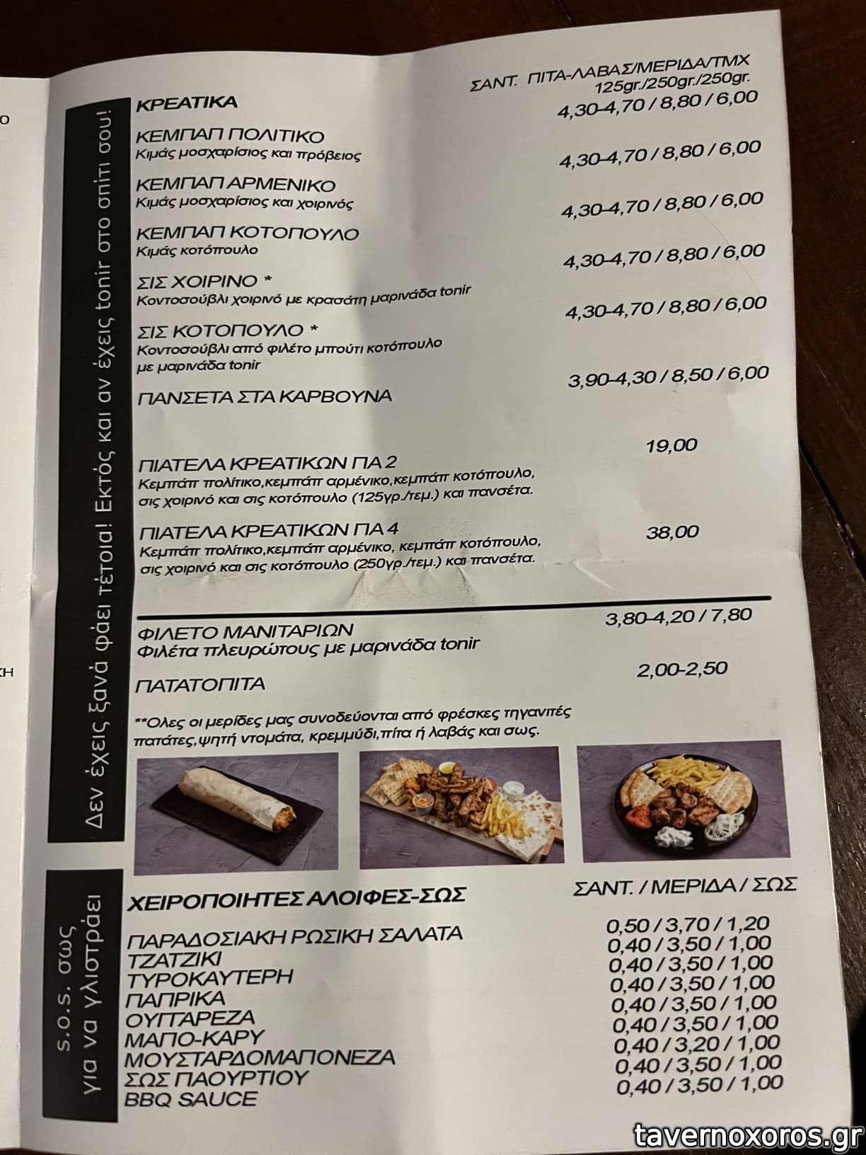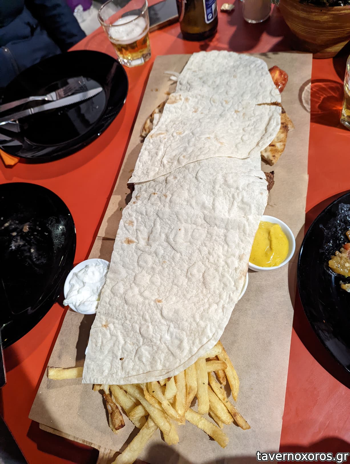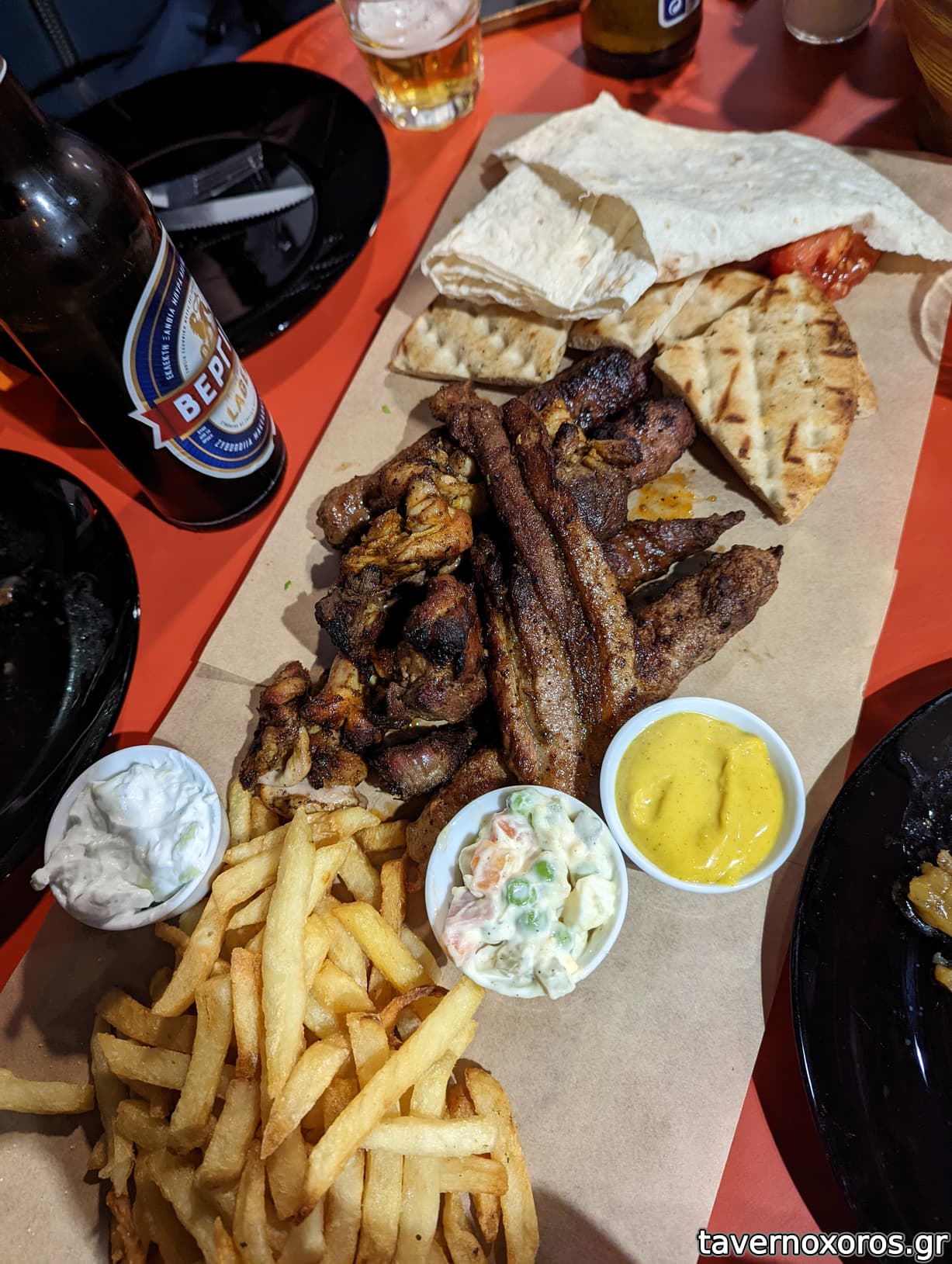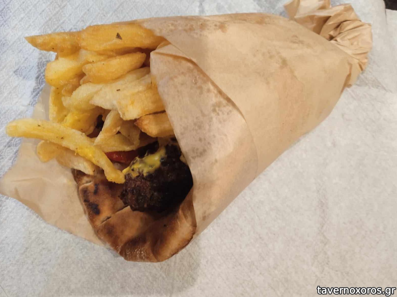 Συνοδεύεται από ψημένη ντομάτα, κρεμυδάκι, λαβάς ή πίτα (ο λαβάς που επέλεξα ήταν γενικά άνοστος) και πατάτες τηγανητές οι οποίες ήταν άνω του μέσου όρου ταβέρνας/γυράδικου.