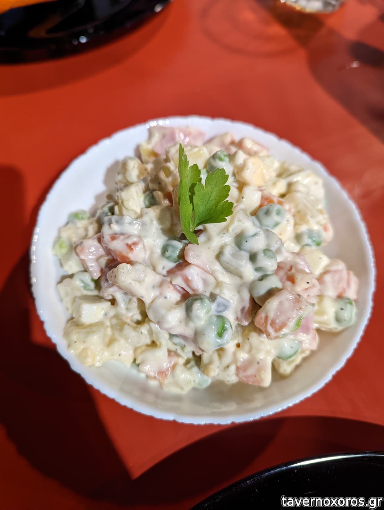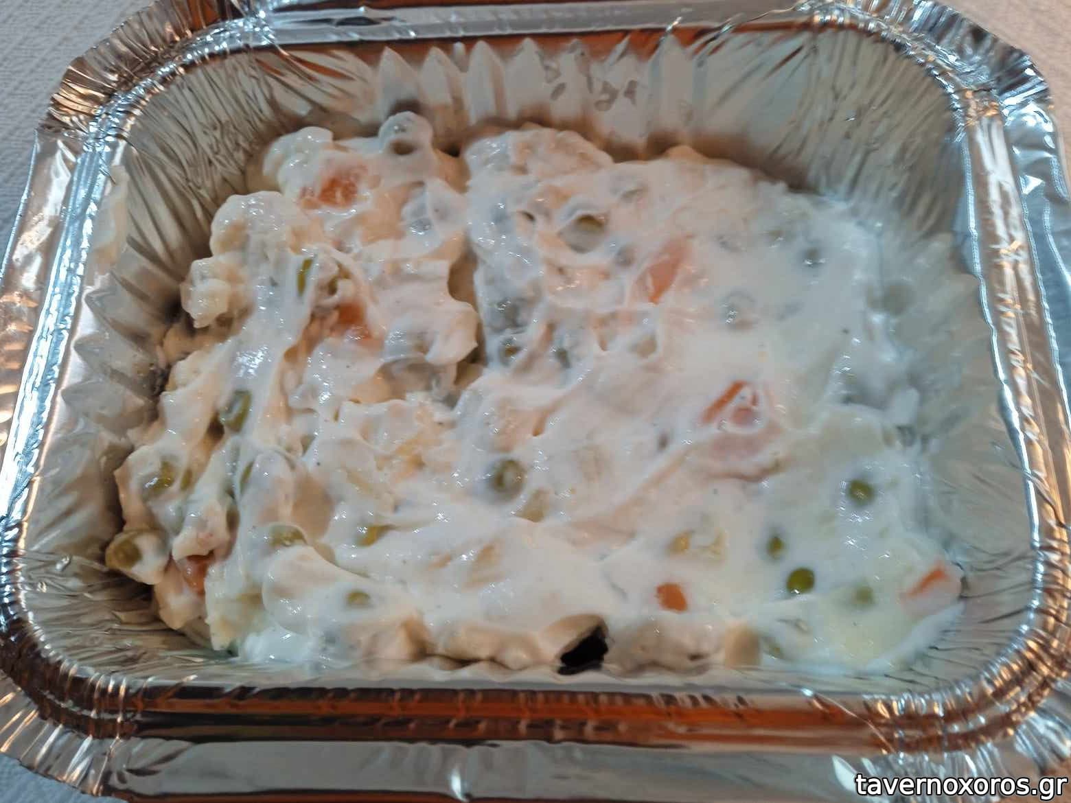 Μερίδα σις κοτόπουλο + μισή ρώσικη/μισή κάρυ-μαγιονέζα (πολύ δυνατά)