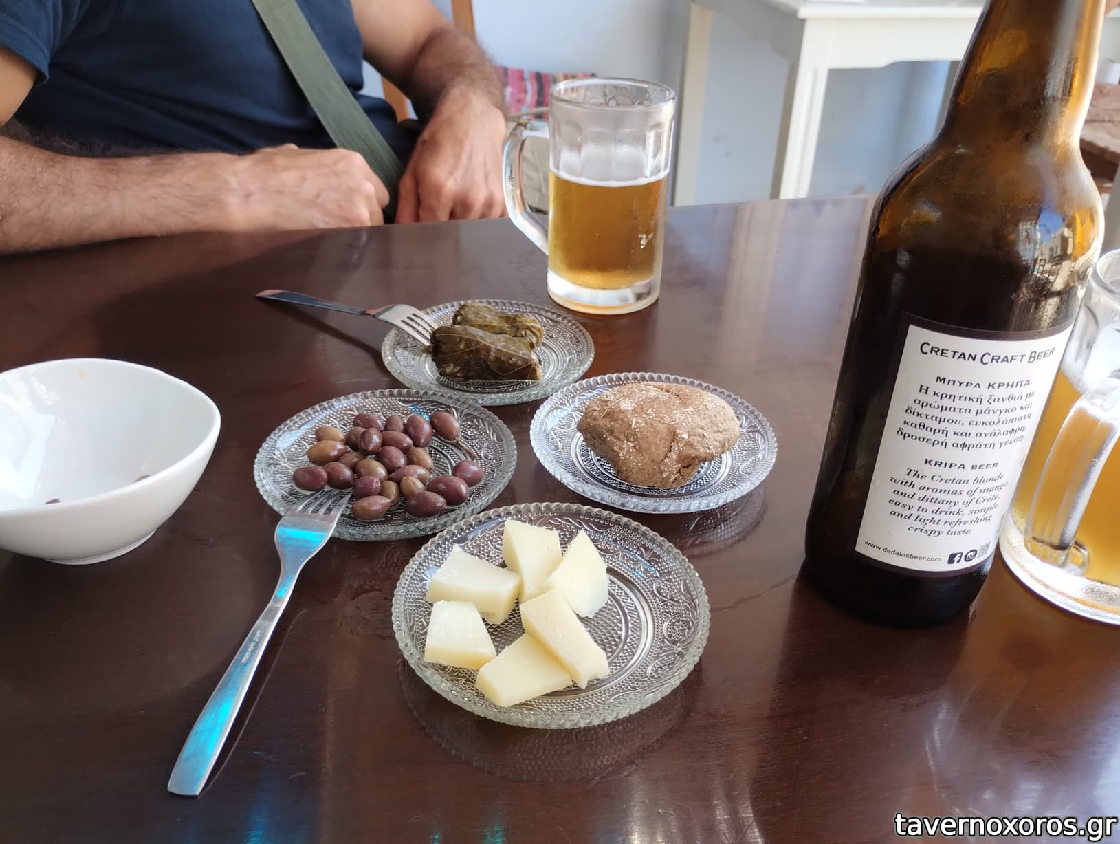 Πήραμε μία μπίρα Κρήπα 500ml (ζυθοποιία Δαίδαλος από το διπλανό χωριό Λούμας). Ενδιαφέρουσα γεύση. Μαζί μάς έφερε ένα σωρό μεζέδες, όπως στις φωτό, και επίσης και 3 ντακάκια και κάτι ακόμα που δε θυμάμαι.