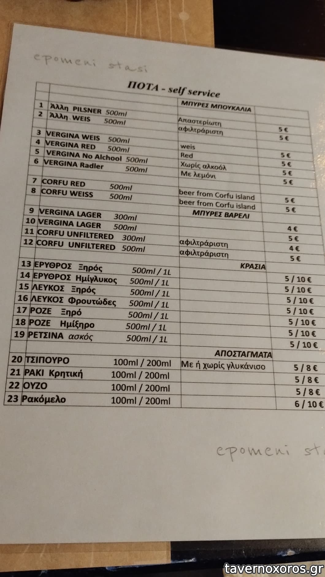 Δοκιμάσαμε σχεδόν όλον τον κατάλογο (σχόλια στις φωτο). Ξεκινήσαμε με Ρακή και γυρίσαμε σε Τσίπουρο-χωρίς, χύμα πάντοτε. Ενα παράδοξο που έχει το μαγαζί είναι ότι το φαγητό είναι κανονικά σερβιριστό, αλλά τα ποτά πρέπει να τα πάρεις σελφ-σέρβις από το μπαρ (και να πληρώσεις χωριστά, φυσικά)!! :) Πληρωμή κανονικα και με POS, όλες τις φορές.
