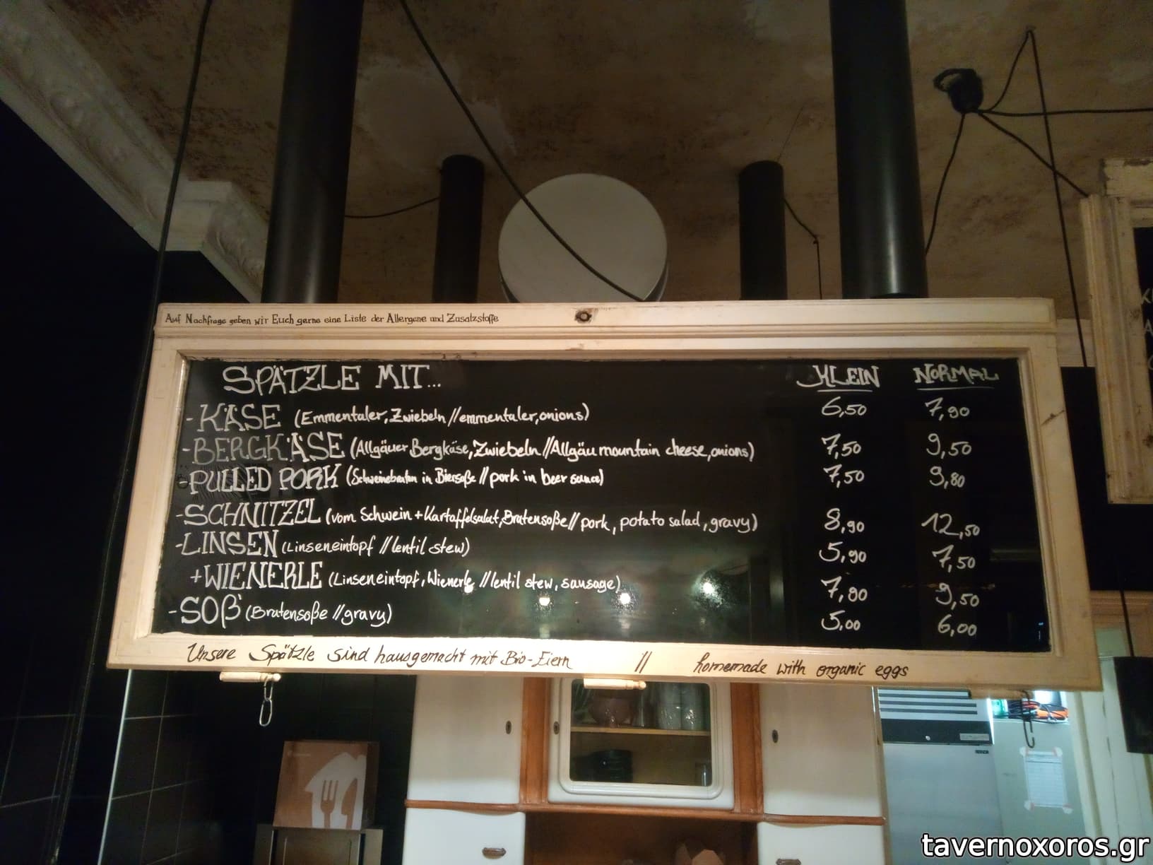 Επίσκεψη σε δημοφιλές στους ντοπιους spatzelάδικο. Εσωτερικά έχει 4-5 μικρά τραπεζια αλλά δουλεύει κατά κύριο λόγο πακέτο. Δοκίμασα spatzel με pulled pork: το ζυμαρικό ήταν γενικά μαλακό, αλλά σε σημεία σκληρό, σαν να προεξείχαν και να μην έβρασαν καλά; Βάζω ερωτηματικό γιατί ήταν η πρώτη μου εμπειρία και δεν ξέρω αν γίνεται ηθελημένα. Το κρεατικό με αρκετά σημεία λίπους - που τουλάχιστον στην ελληνική εκδοχή του δεν τα βρίσκεις. Συνολικά το βρήκα άνοστο, δεν υπήρχε κάποιο ενδιαφέρον π.χ. με μπαχαρικά, αλλά αντιλαμβάνομαι πως σε άλλες εκδοχές του βάζουν πολύ τυρί από πάνω, και αυτό μάλλον δίνει ενδιαφέρον. Μου θύμισε ζυμαρικά που θα έκανε κάποιος επιστρέφοντας πιωμένος στο σπίτι του, όπου προτεραιότητα είναι να μπει ποσότητα στο στομάχι για να ηρεμήσει.
