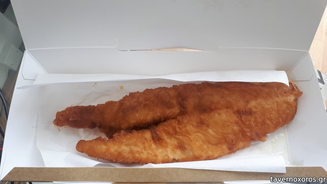 80 και μου έφεραν απλά ένα μεγάλο φιλέτο (της φωτογραφίας), δίχως πατάτες, μόνο με μερικές σάλτσες malt vinegar..