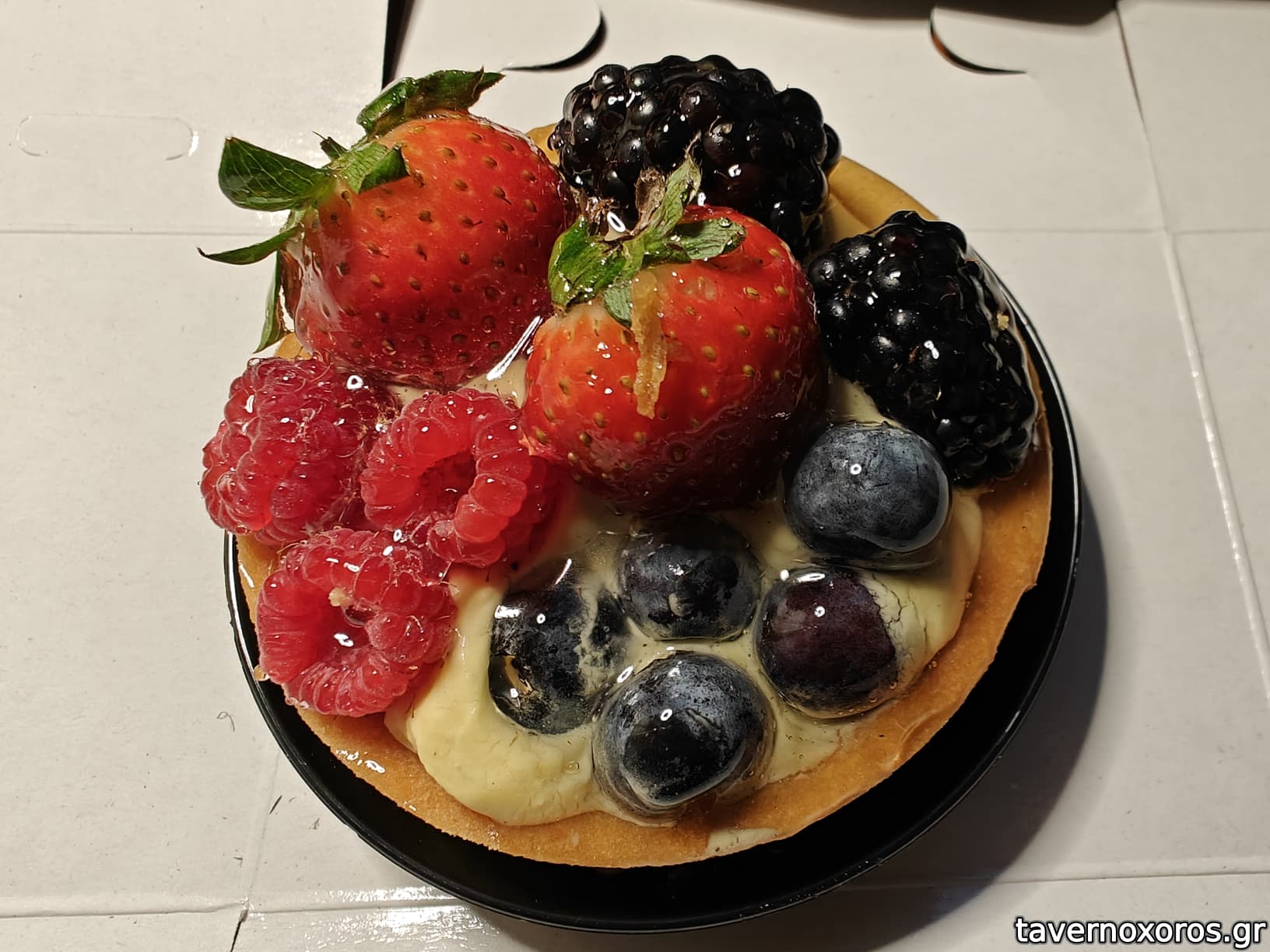 Ελέω παραλαβής πραγμάτων από γειτονικό κατάστημα, μας έκλεισαν το μάτι οι τάρτες που είχε στη βιτρίνα. Χτυπήσαμε μια οικογενειακή, μαρεσε η βάση, ωραία φρέσκα φρούτα από πάνω, η κρέμα λίγο περίεργη -οχι η κλασσικη ζαχαροπλαστικής, και απουσία από σαντιγί- αλλά πολύ νόστιμη.