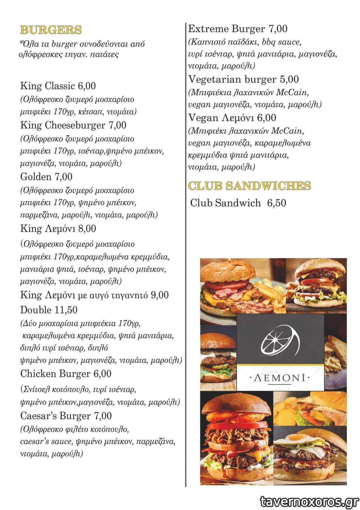 | Λέξεις κλειδιά | #burgers, #snacks, #κολοκυθοκεφτέδες, #ταλτσένο, #μανιτάρια, #φάβα, #πρόβειο λουκάνικο, #παστουρμάς, #καβουρμάς, #γλώσσα μοσχαρίσια, #μελιτζάνα τηγανητή, #πιπεριές, #κολοκυθάκια, #ντοματοκεφτέδες, #αϊβάρ, #ντάκος, #ζυμαρικά, #ριζότο, #μακαρονάδες, #κοκκινιστό, #χυλοπίτες, #φασόλια γίγαντες, #σουτ μακάλο, #σουβλάκια, #σουτζουκάκια, #κεμπάπια, #πανσέτα, #λουκάνικο, #τηγανιά, #σνίτσελ, #ψαρονέφρι, #παϊδάκια, #κοτόπουλο, #κοντοσούβλι, #πανσετομπριζόλα, #μπιφτέκι, #καβουροσαλάτα, #γαρίδες, #μύδια, #γαύρος, #χταπόδι, #γαριδομακαρονάδα |