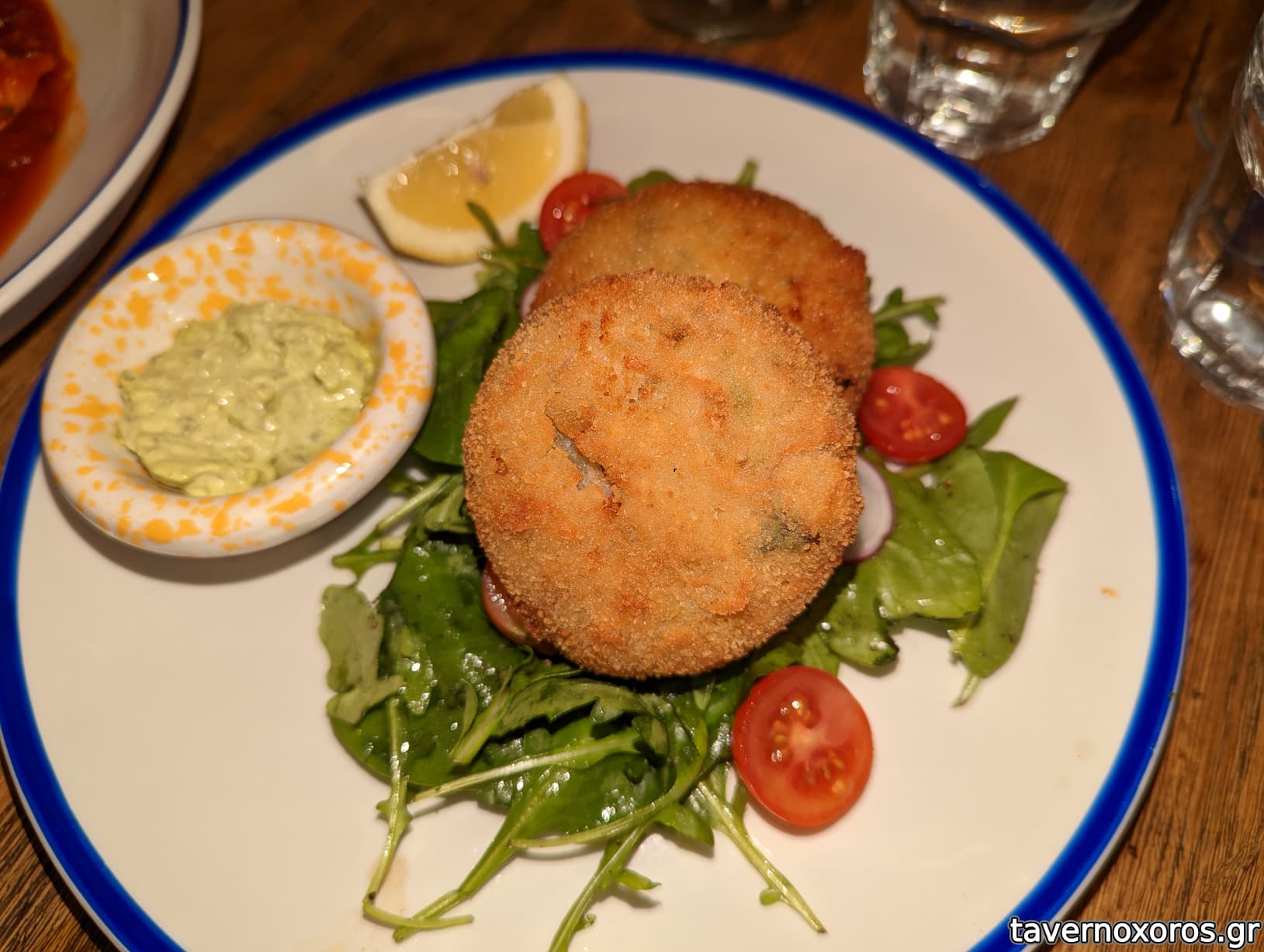 "Tuna and potato patties served with a spring salad and basil emulsion" (απλώς οκ)