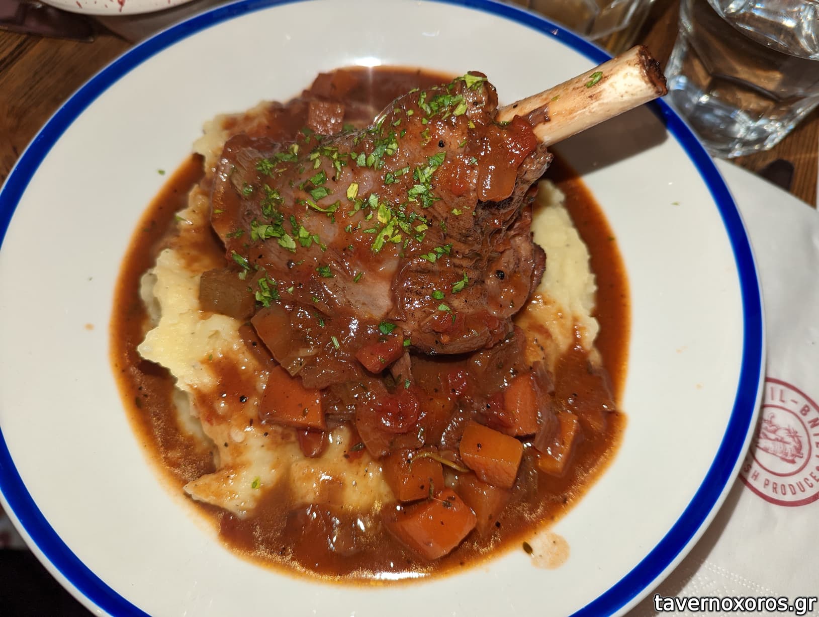 "Low braised lamb shank in our house wine with rosemary, celery, carrots and served with mashed potatoes" (απλώς οκ)