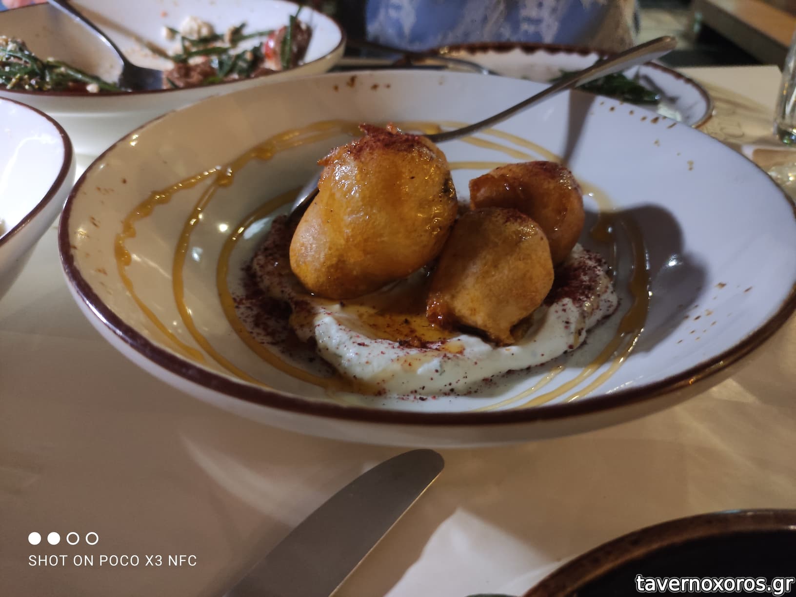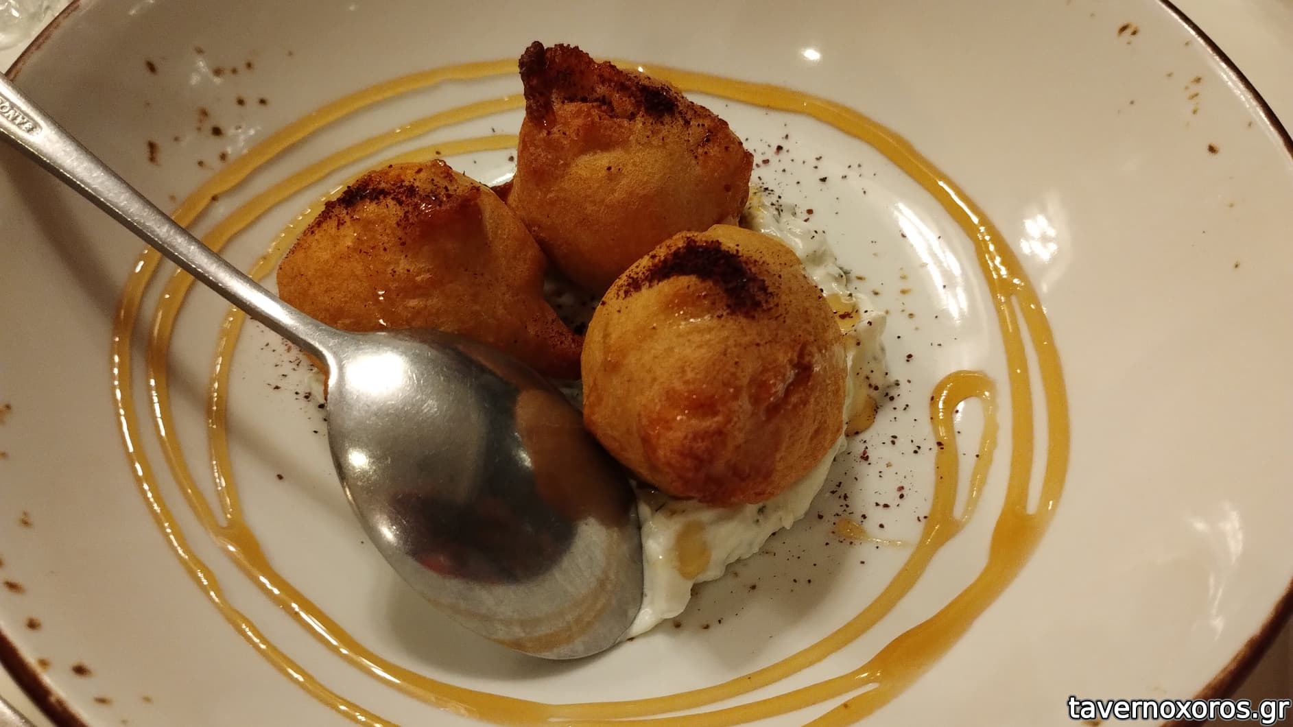 Λουκουμάδες με παστουρμά και γιαούρτι με μέλι (από ένας στον καθένα, πάλι δεν είπε σπουδαία πράγματα)