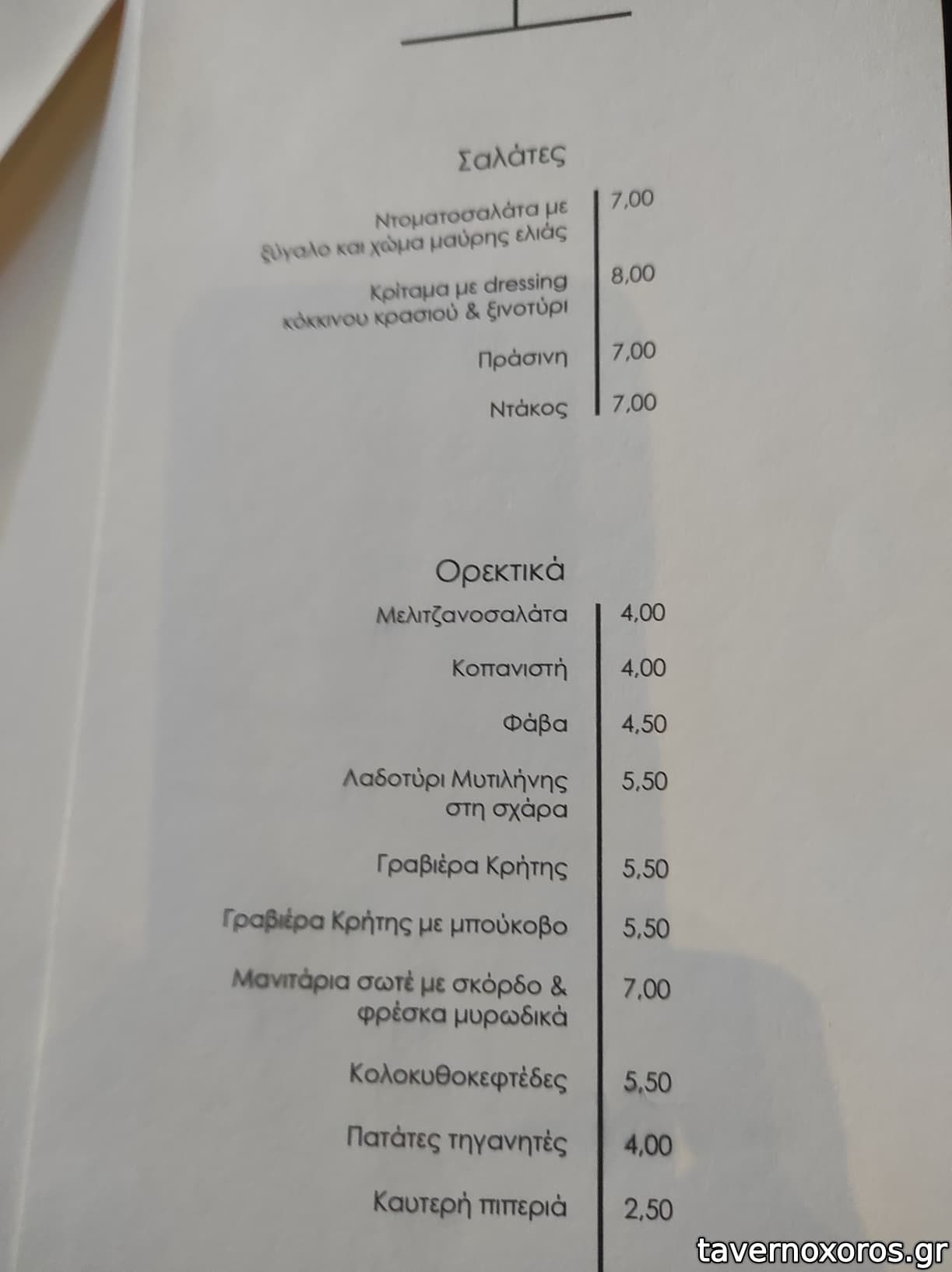 Στα του φαγητού, δοκιμάστηκαν κοπανιστή (καλή), σαλάτα μεσκλάν (οκ), μανιτάρια σωτέ (καλά), συκώτι (καλό), κότσι χοιρινό (πολύ καλό) και πανσέτα φούρνου (πολύ καλή). Μαζί με 3 τσίπουρα μας βγήκε περίπου 90€.